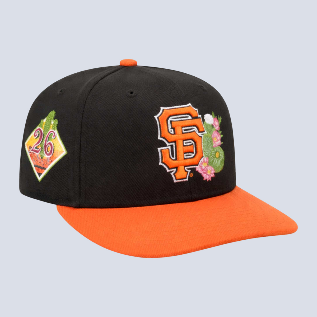 The Giants 2026 Spring Training Baseball Cap features a sleek black crown paired with a bright orange curved brim, creating a powerful contrast that instantly reflects San Francisco’s iconic color palette. On the front, the interlocking “SF” logo is embroidered in vivid orange with clean white outlining, delivering sharp definition against the black background. Beside the logo, detailed cactus and desert flower embroidery adds a unique Spring Training touch, honoring the Arizona setting where the preseason unfolds. On the side panel, a diamond-shaped “26” patch with cactus imagery marks the 2026 edition, reinforcing its seasonal significance. The structured six-panel design ensures a secure, athletic fit, while embroidered eyelets enhance breathability during warmer days.