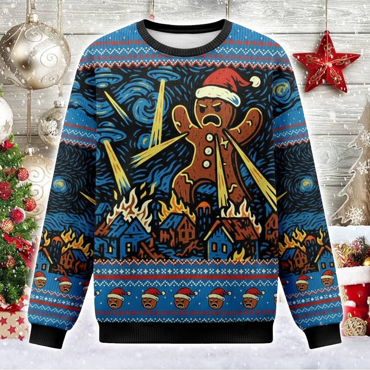 The centerpiece of the sweater features an oversized gingerbread man, wearing a Santa hat and glowing with power, towering over a burning village in a comic-book style scene. Bright yellow beams of energy shoot from the sky, swirling around him in a dramatic, stormy blue background. Flames rise from the houses below, adding to the chaotic humor of the scene. The gingerbread man’s furious expression and the dynamic illustration make the sweater feel like a holiday movie poster gone wild.