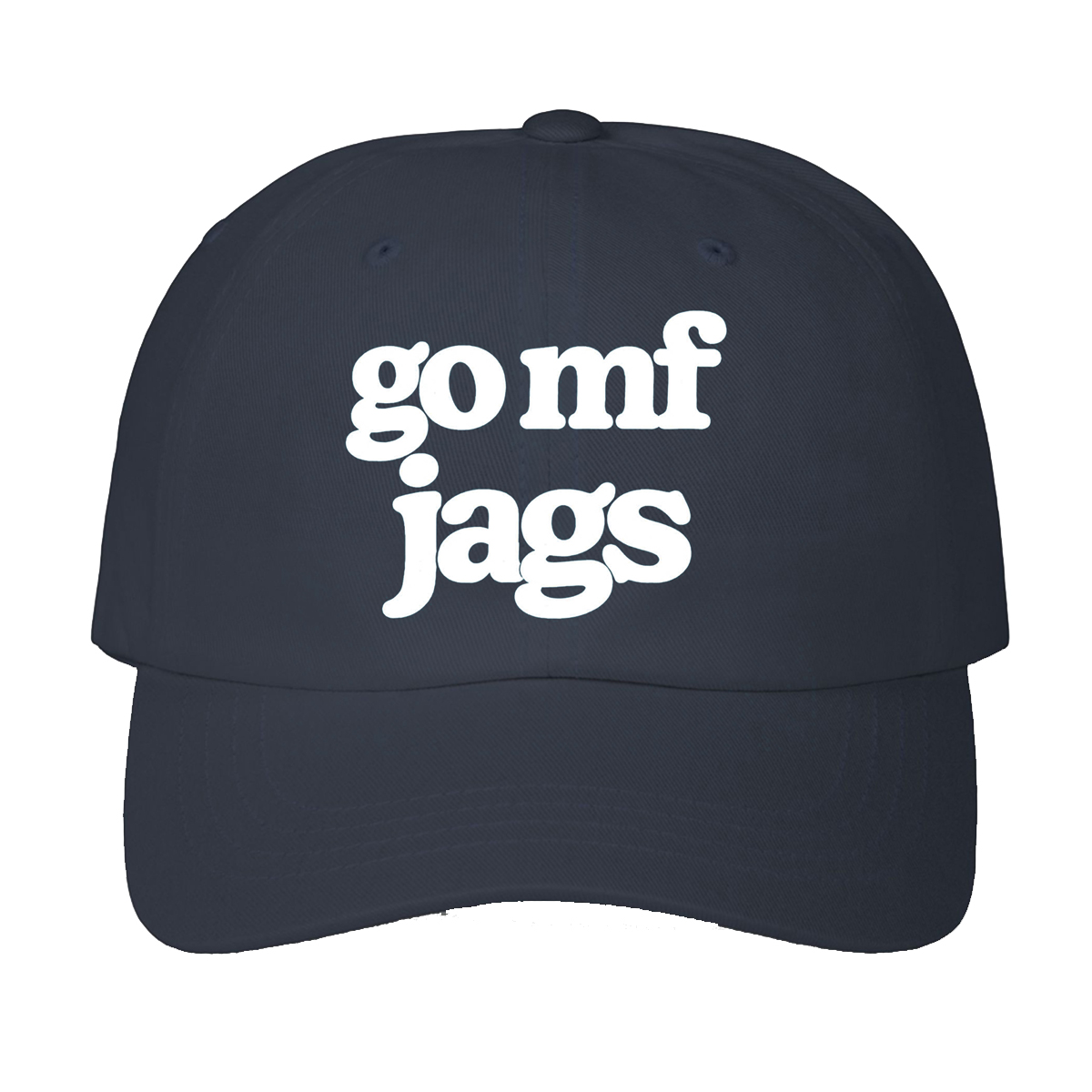 Design-wise, the Go Mf Jags Jacksonville Jaguars Hat keeps things clean and intentional. The deep navy crown creates a strong, understated base, while the front text stands out in bold white lettering. The typography is rounded and slightly playful, balancing humor with attitude, making the message feel natural rather than forced. The centered placement ensures instant readability, while the curved brim provides a classic silhouette that works effortlessly with everyday outfits. Ventilation eyelets are subtly integrated, maintaining a streamlined look without visual clutter.