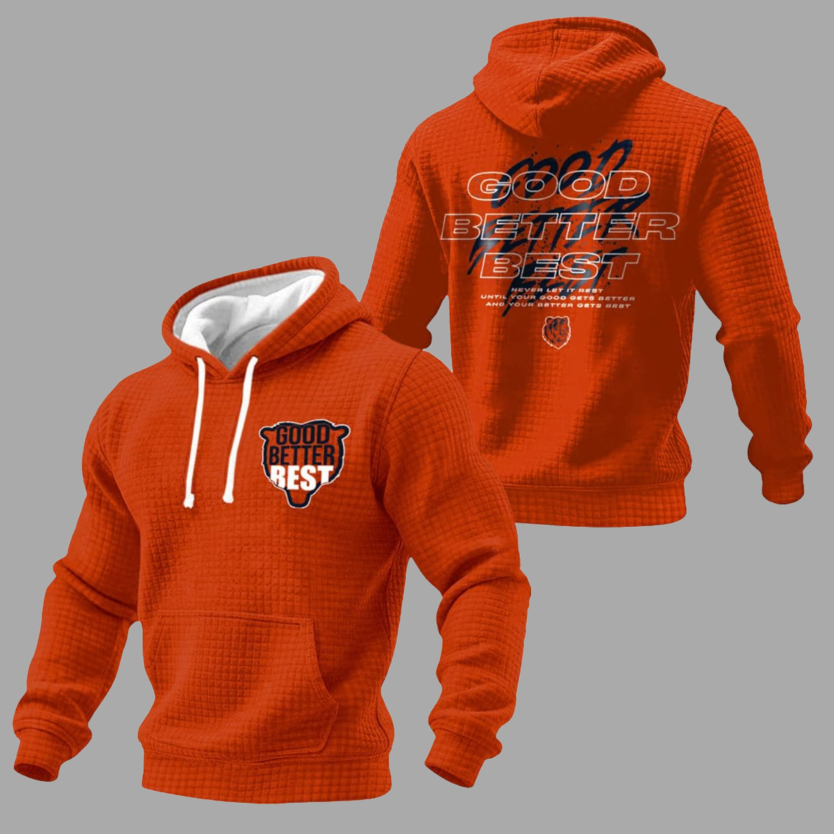 This hoodie features a rich orange color with a unique waffle-knit texture that sets it apart from ordinary hoodies. On the front, the phrase “Good Better Best” sits within a bear-shaped emblem, giving the design personality and a touch of fierce determination. The back amplifies the message with bold typography layered in three levels GOOD, BETTER, BEST alongside the motivational line: Never let it rest until your good gets better and your better gets best. This inspiring quote became widely shared during a trending moment in the 2025 season, when fans and players alike embraced its meaning as a mindset for improvement and resilience.