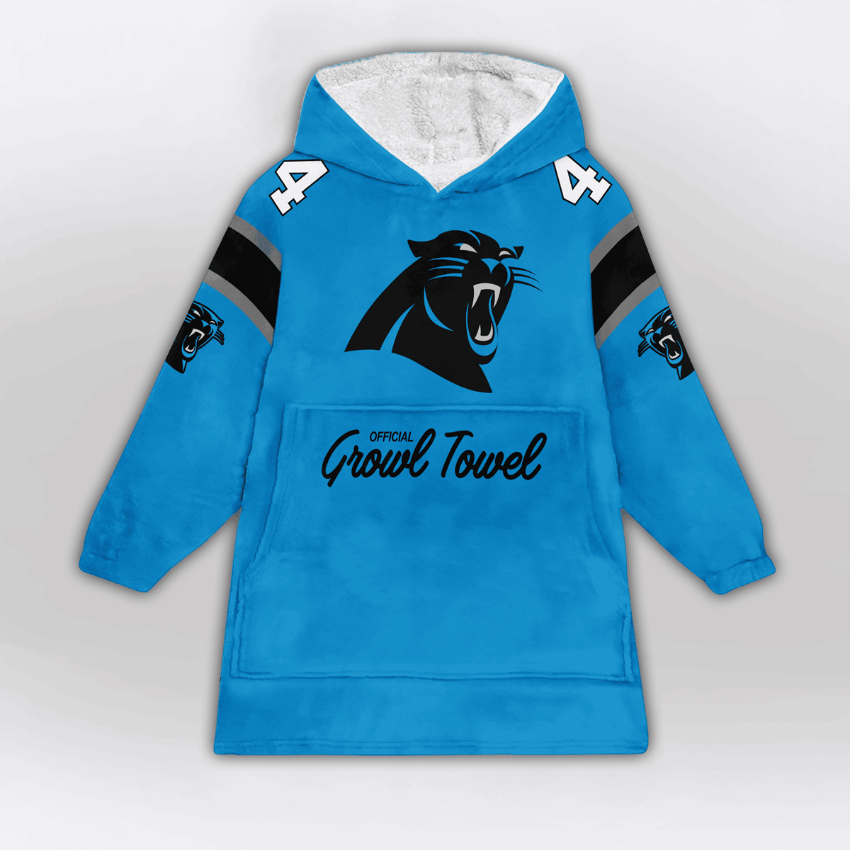 This hoodie blanket is designed for those who live and breathe the roar of the Panthers. Coated in a striking shade of Carolina blue, it features the team’s fierce black panther head printed boldly across the chest, a symbol of power and determination. The words “Growl Towel” below the logo add a unique touch that connects back to one of the most spirited fan traditions, where thousands wave their towels in unison to lift their team higher.