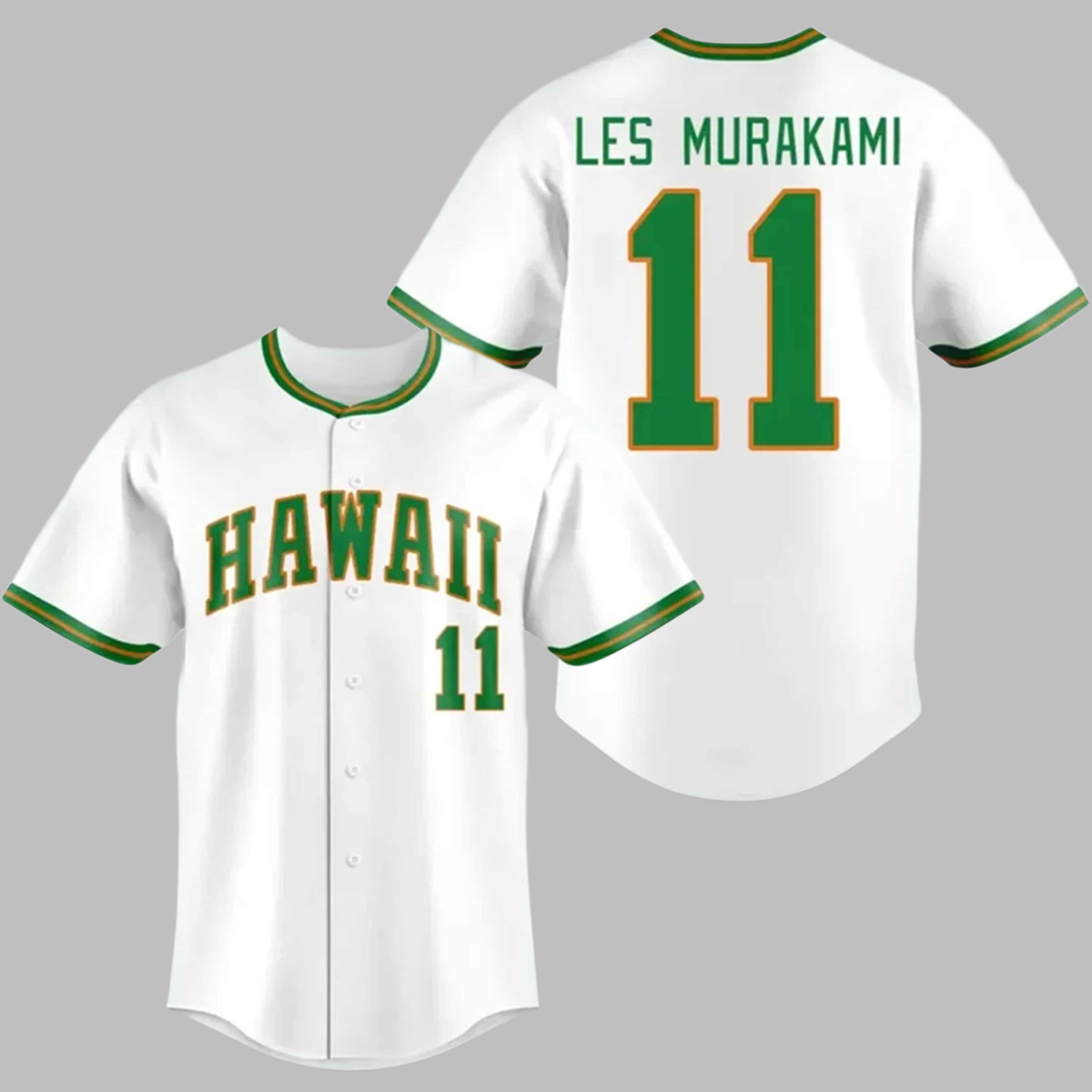 The Hawaii Baseball 2026 Honor Coach Les Murakami Baseball Jersey features a clean white base with green and gold accents that reflect Hawaii’s traditional baseball identity. The front showcases bold “Hawaii” lettering paired with the number 11, a design choice closely associated with Coach Murakami’s legacy and era.