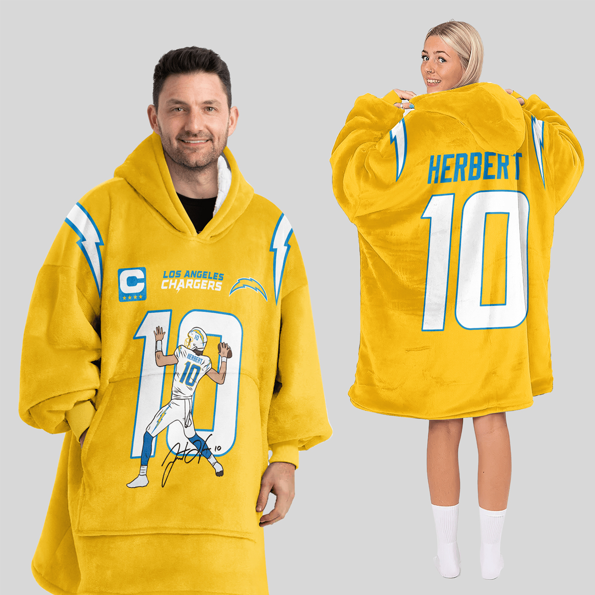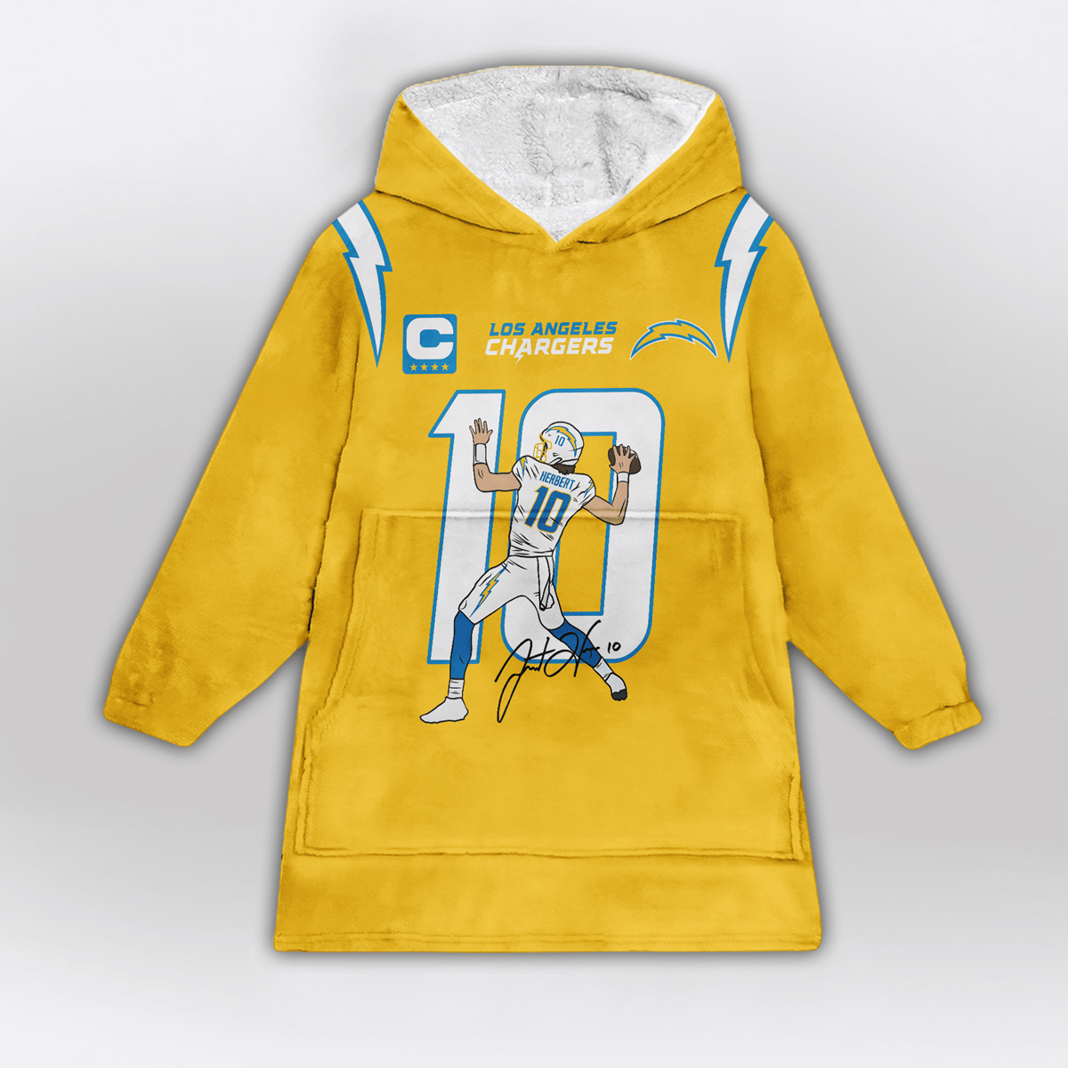 The Herbert 10 Chargers Football Unisex Blanket Hoodie is a must-have for any fan of the Los Angeles Chargers. Featuring the number “10” on the back, this hoodie is a tribute to one of the team’s standout stars. The front showcases a bold graphic of the player in action, complete with his signature and the iconic captain’s “C” logo on the chest. With its vibrant yellow design and blue accents, this hoodie is impossible to miss and offers a unique way to show off your Chargers pride.