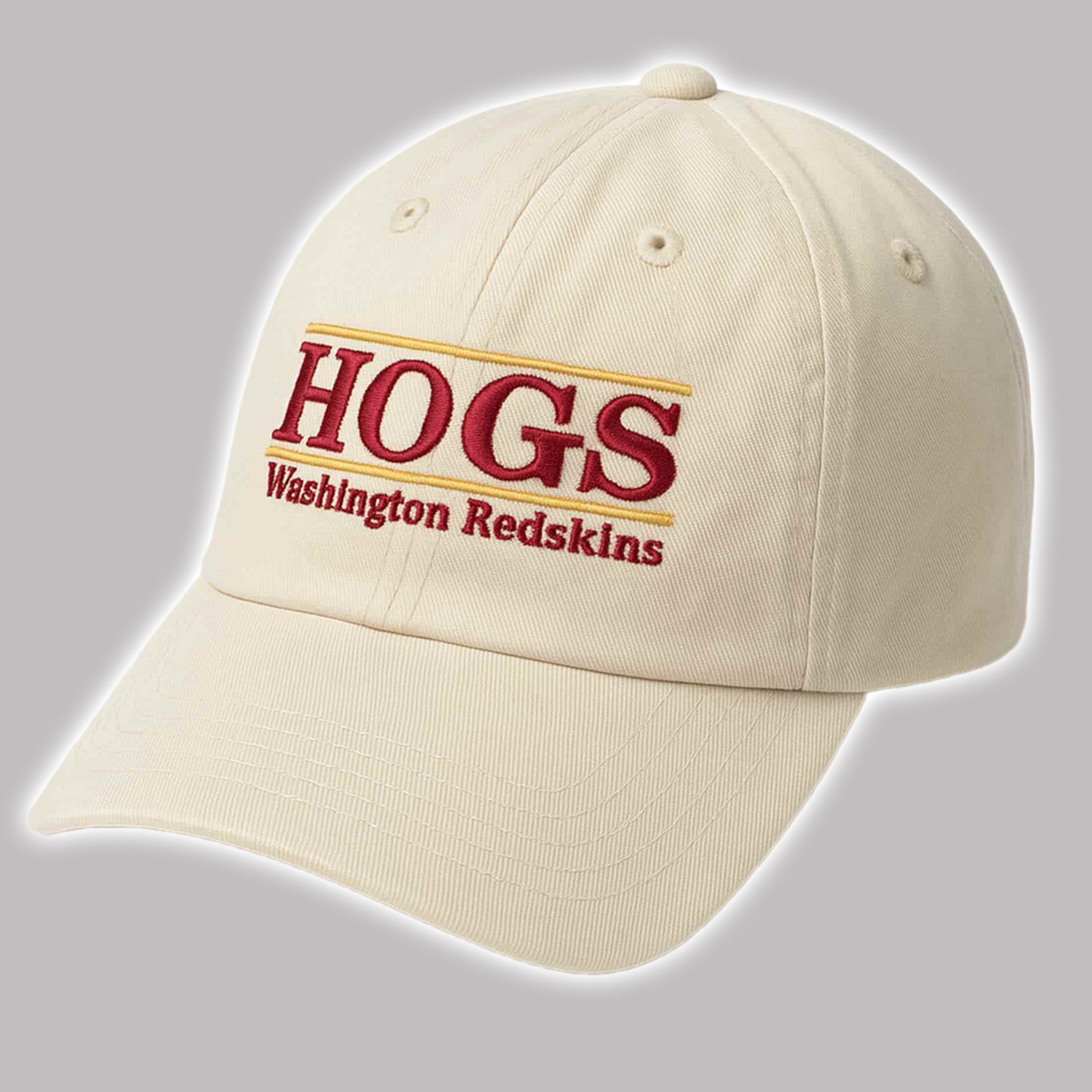 The Hogs Washington Redskins Hat features a clean, vintage-inspired cream color that perfectly complements the bold red and gold embroidery on the front. The word HOGS is prominently stitched in a strong, blocky font, accented by gold stripes above and below for extra flair. Just below it, “Washington Redskins” is embroidered in classic red, honoring the team’s historical roots and the legendary group of linemen that dominated the trenches. The curved brim, eyelet ventilation, and adjustable strapback make it suitable for any head size and perfect for everyday wear, tailgates, or nostalgic game-day vibes.