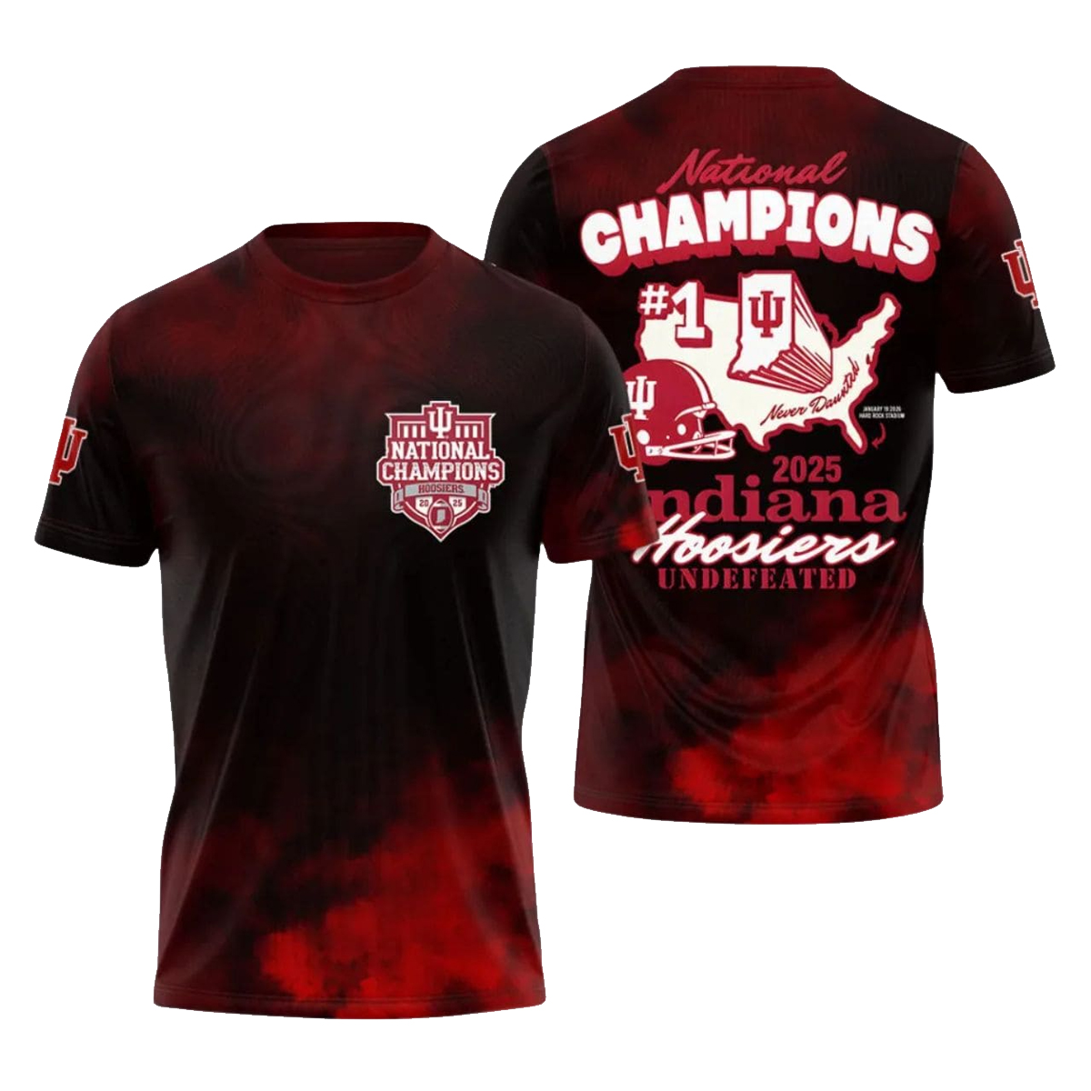 Turn it around, and the story unfolds in full. Bold “National Champions” lettering crowns the back, paired with “Indiana Hoosiers” and 2025 prominently displayed. A #1 callout, helmet graphic, and a stylized map silhouette reinforce the dominance of the season and the pride of place. The word “Undefeated” anchors the message, making the achievement unmistakable at a glance. The all-over print technique ensures the graphics flow seamlessly across seams, creating a cohesive, high-impact look.
