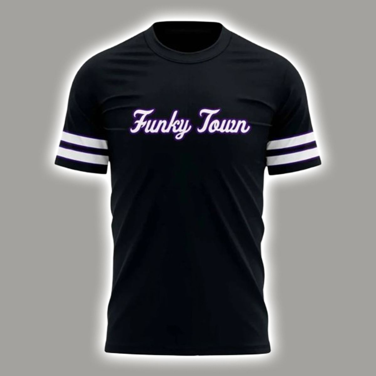 This exclusive black athletic style t-shirt is designed for comfort and maximum spirit. The front features the phrase Funky Town in a striking, curving purple script font, paying homage to the well known local nickname. The shirt is designed with classic white stripes ringing the sleeves, giving it a distinctive sporty, vintage jersey feel perfect for game days.