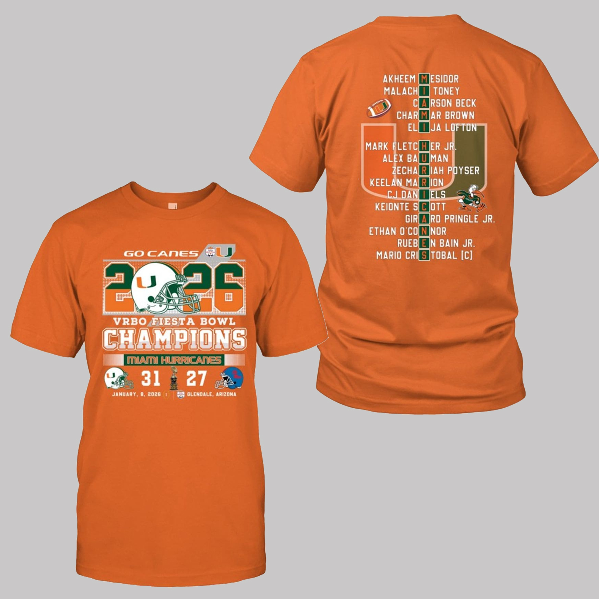 In conclusion, the Hurricanes 31-27 Rebels 2026 Fiesta Bowl Champions Shirt stands as a tribute to a hard-fought victory and a season that ended exactly the way fans hoped. With its bold visuals, clear scoreline, and roster-inspired back design, it preserves a championship moment in wearable form. If you want a shirt that tells the full story of the 2026 Fiesta Bowl win, this one earns its place in your rotation.