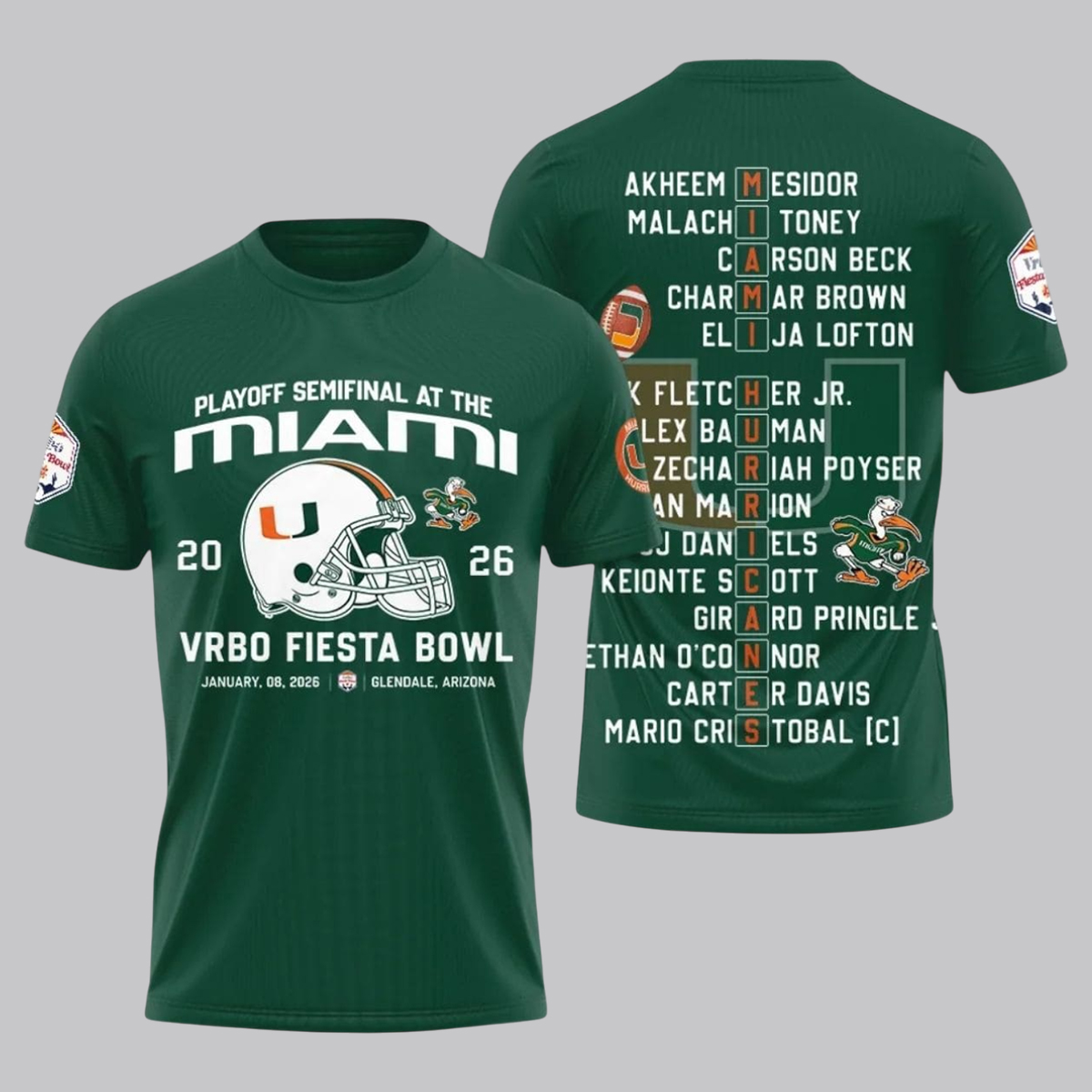 The Hurricanes Vrbo Fiesta Bowl 2025 Shirt is designed around the playoff semifinal clash held in Glendale, Arizona, on January 6, 2025. The deep green base immediately reflects Hurricanes tradition, while the front graphic sets the scene with strong typography reading “Playoff Semifinal at the Miami Vrbo Fiesta Bowl.” A classic football helmet graphic anchors the center, flanked by the year 2025, creating a balanced and instantly recognizable design.