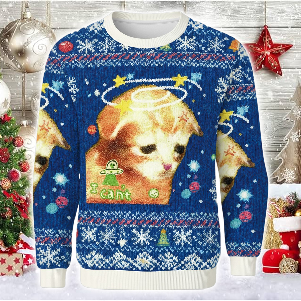This sweater features a beautifully woven image of an adorable orange kitten with big, tearful eyes and a glowing halo above its head. Surrounding the cat are playful doodles of stars, snowflakes, pastel dots, and a tiny green UFO icon paired with the phrase “I Can’t”, a truly viral expression that captures the mix of chaos and cuteness we all feel during the holiday rush. The deep blue background is decorated with classic seasonal icons like snowflakes, Christmas trees, and festive borders that give the sweater an authentic winter celebration look. The design feels nostalgic, warm, and whimsically chaotic in a way that instantly grabs attention.