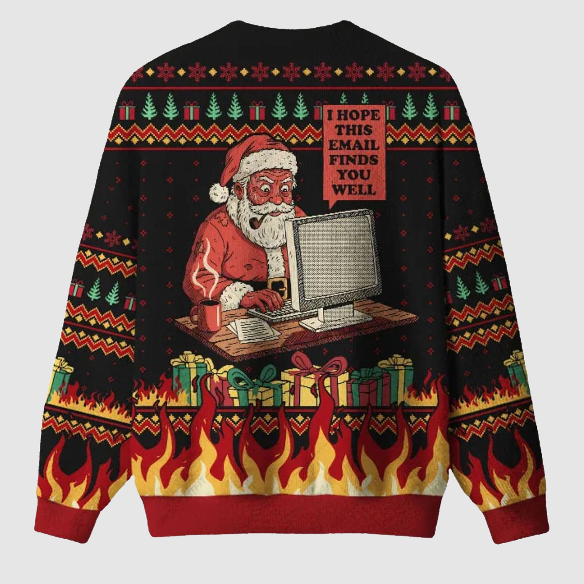 The I Hope This Email Finds You Well Ugly Christmas Sweater features a mischievously detailed design of Santa Claus hard at work on his computer, surrounded by wrapped presents and blazing flames, a perfect visual metaphor for end-of-year deadlines and inbox overload. Above his screen, a red box reads the iconic line: “I hope this email finds you well,” setting the tone for the kind of dark office humor that makes this sweater a hit among coworkers, creatives, and anyone who’s survived the corporate grind.