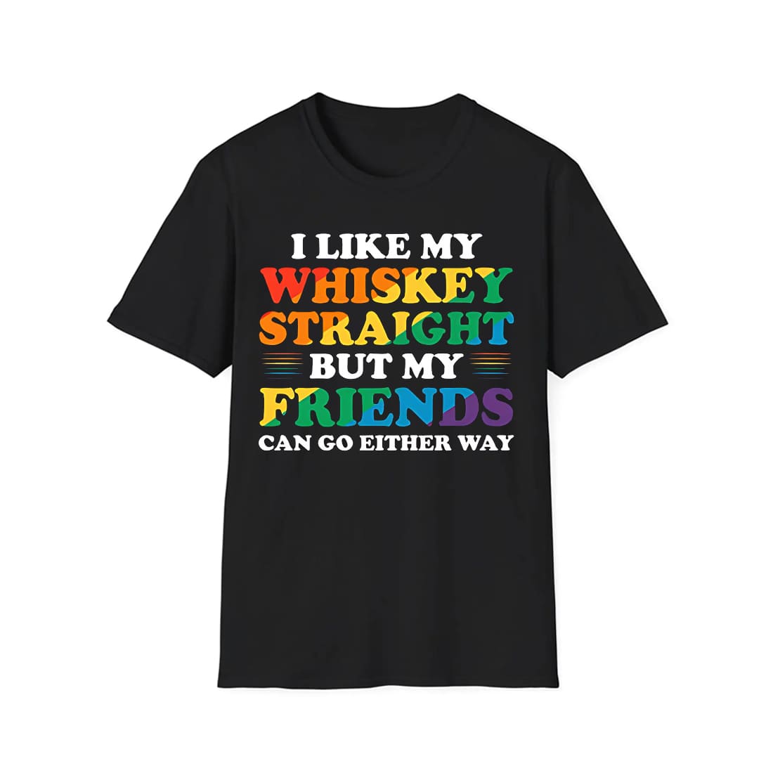 The classic black T-shirt is printed with the bold words: I LIKE MY WHISKEY STRAIGHT BUT MY FRIENDS CAN GO EITHER WAY. With the words WHISKEY STRAIGHT and FRIENDS highlighted in the vibrant rainbow colors that are familiar symbols of the gender community. The remaining lines use white to create a clear contrast.