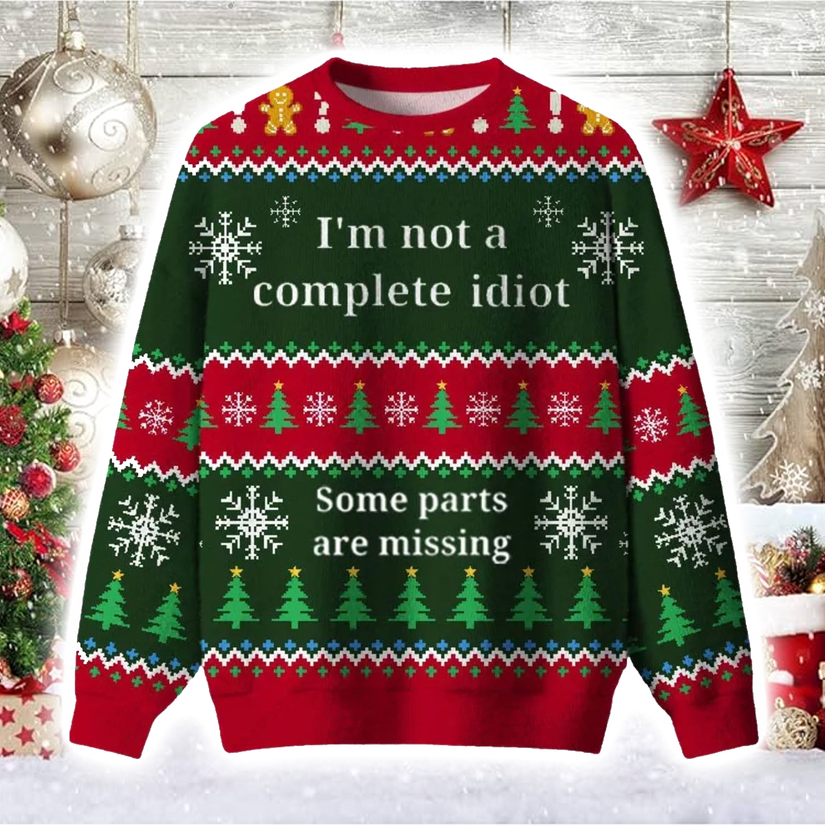 Draped in classic holiday colors of red, green, and white, this sweater captures the perfect balance of holiday joy and humor. The playful message: “I’m not a complete idiot. Some parts are missing.” sits proudly across a background of snowflakes, Christmas trees, and gingerbread men, giving a nostalgic touch to its witty design. It’s not just funny; it’s a conversation starter that guarantees laughter wherever you go.