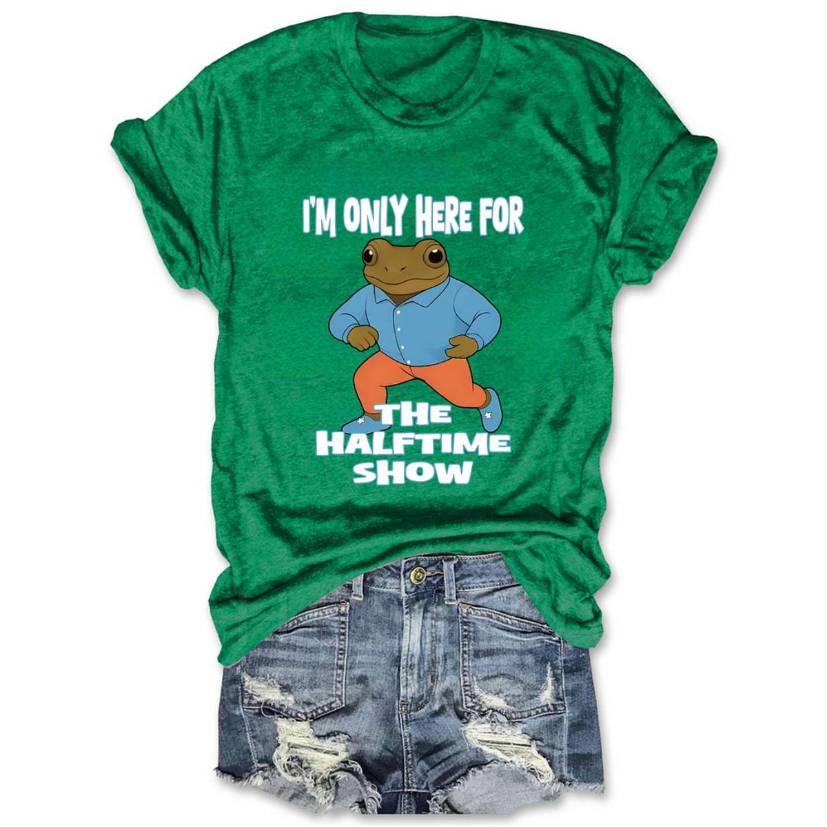This shirt plays off the viral trend of fans watching the halftime show, especially the 2023 Super Bowl performance by Bad Bunny, rather than the game. The frog character in the shirt symbolizes the playful, laid-back vibe of enjoying the spectacle over the sports event itself. It’s a fun tribute to the star-studded halftime performances that have become cultural milestones.