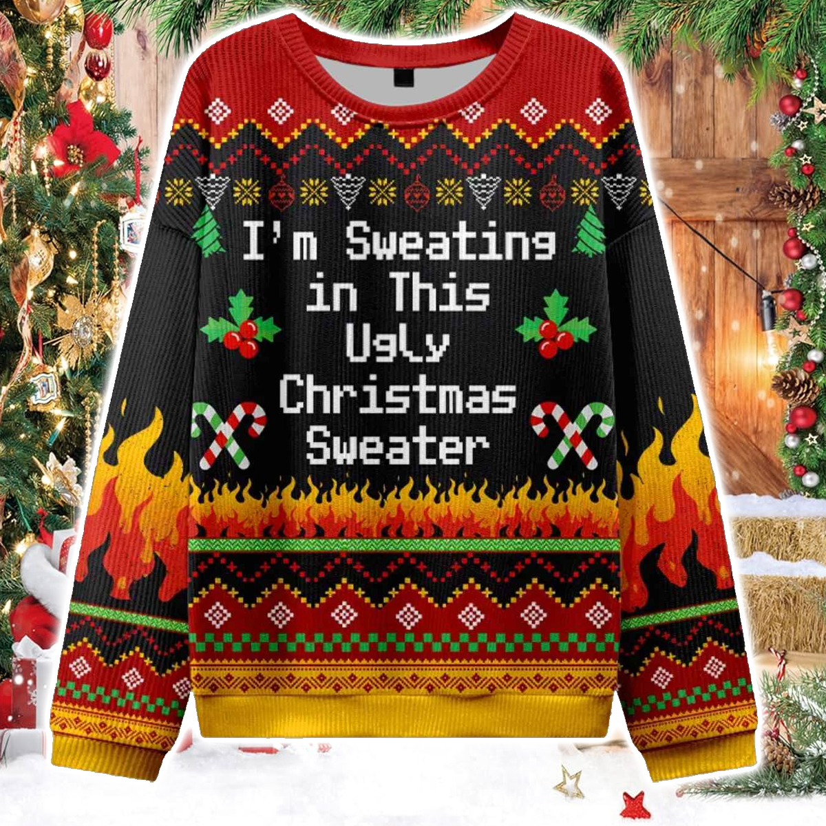 This sweater features an explosive mix of cozy Christmas patterns and literal flames rising across the bottom hem and sleeves. The bold white text “I’m Sweating in This Ugly Christmas Sweater” sits right at the center, surrounded by classic holiday icons like holly berries, candy canes, Christmas trees, and geometric Nordic borders. The overall palette with bright reds, warm yellows, deep blacks, and festive greens, gives the sweater a striking look that stands out instantly in a crowd. Last December, funny text-based sweaters became one of the most popular choices at Ugly Sweater Contests, holiday office parties, and winter bar crawls.