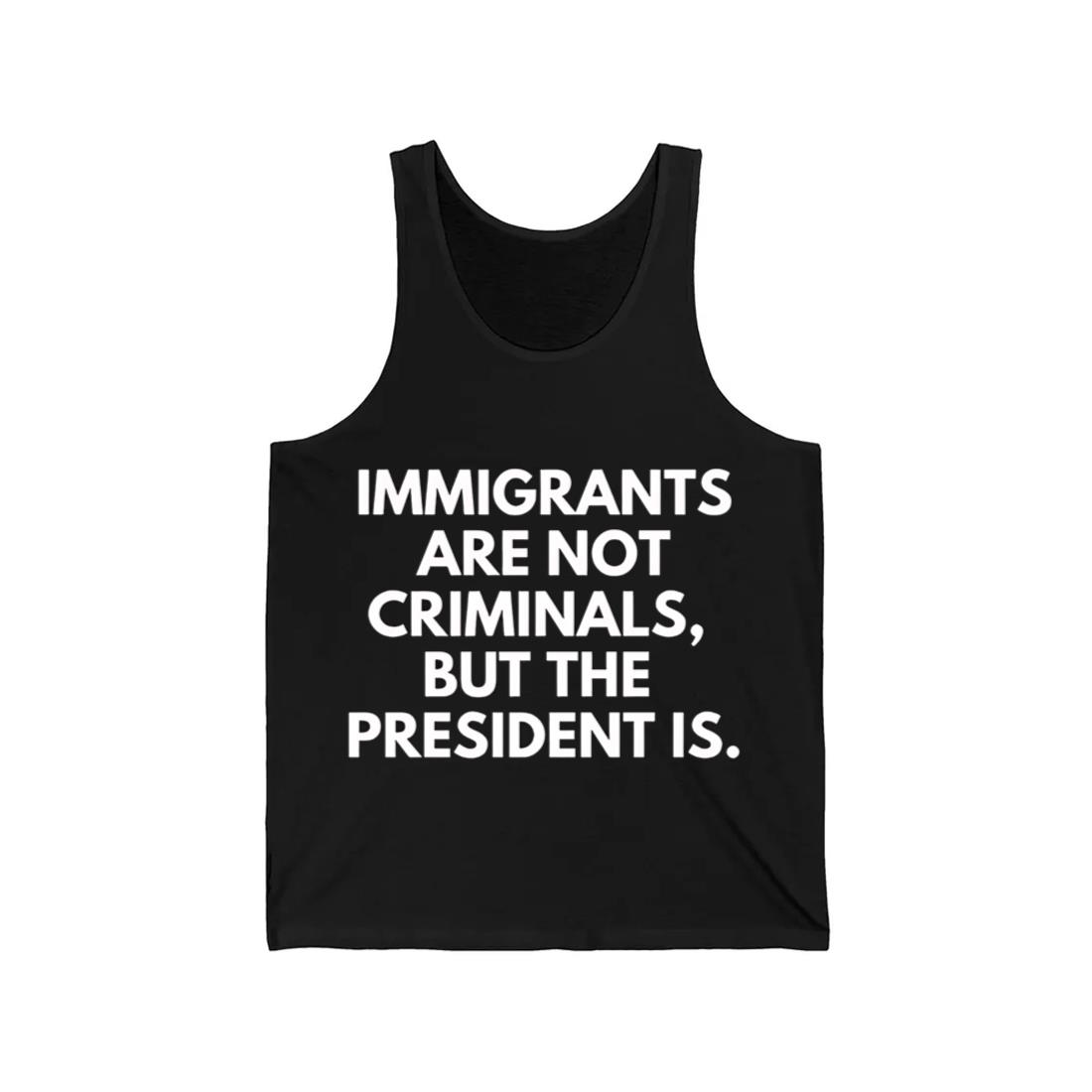 The Immigrants Are Not Criminals But The President Is shirt Shirthas no secondary motifs, no icons or illustrations, all focused on conveying a clear, strong political message that needs no further explanation.