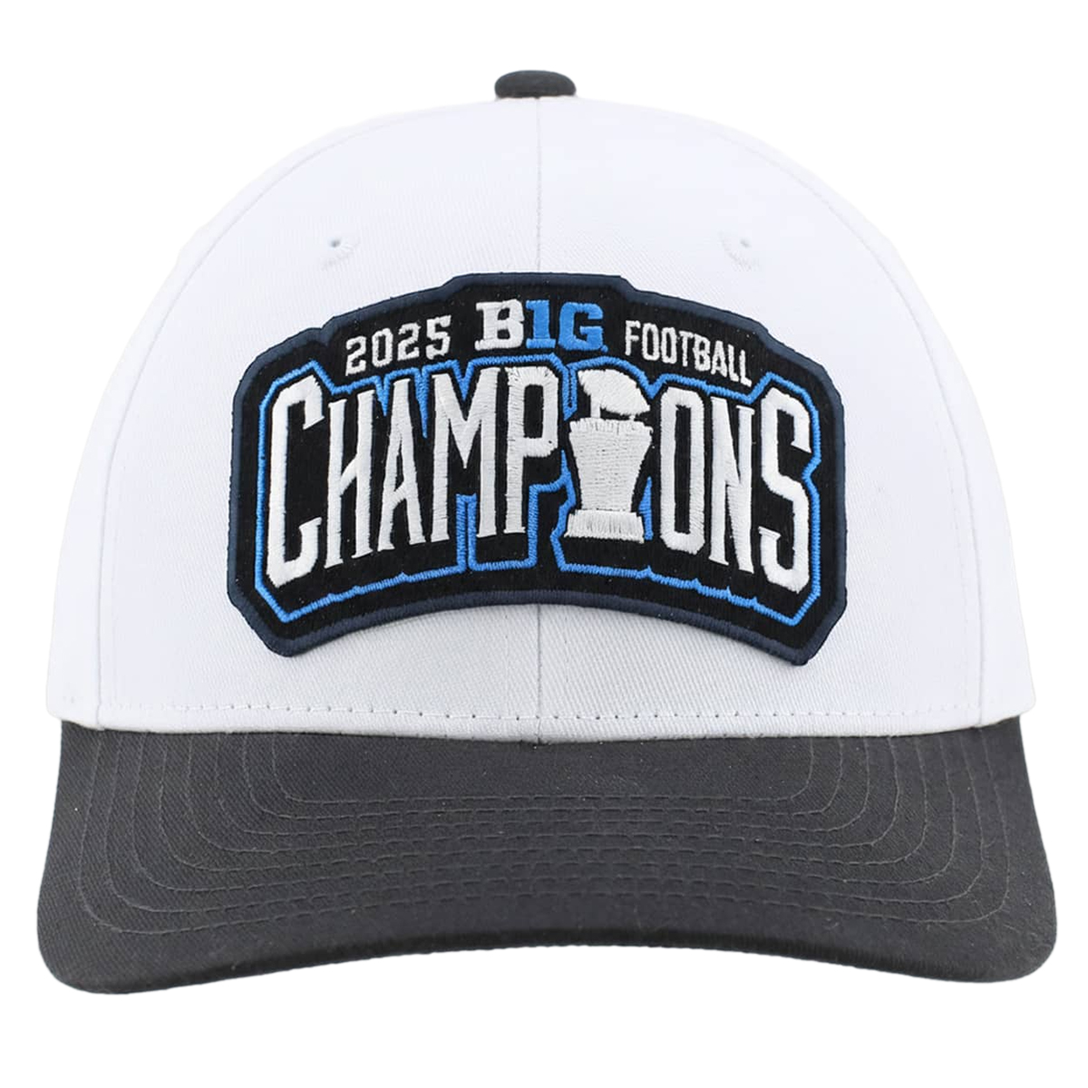 This hat features a clean white crown paired with a charcoal black bill, giving it a bold, modern look that stands out effortlessly. The front showcases an embroidered championship patch reading “2025 Big Ten Football Champions,” detailed with a trophy icon and accented in blue and black stitching for a crisp, standout finish. The structured design ensures a comfortable fit, while the high-quality stitching reflects durability and attention to detail.