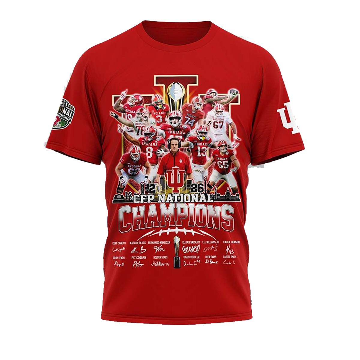 Below the imagery, “2026 CFP National Champions” text anchors the design, while a row of printed player-style signatures adds a commemorative touch, giving the shirt the feel of a keepsake rather than just apparel. Subtle sleeve graphics, including an IU mark and a championship emblem, complete the look without overcrowding the design.