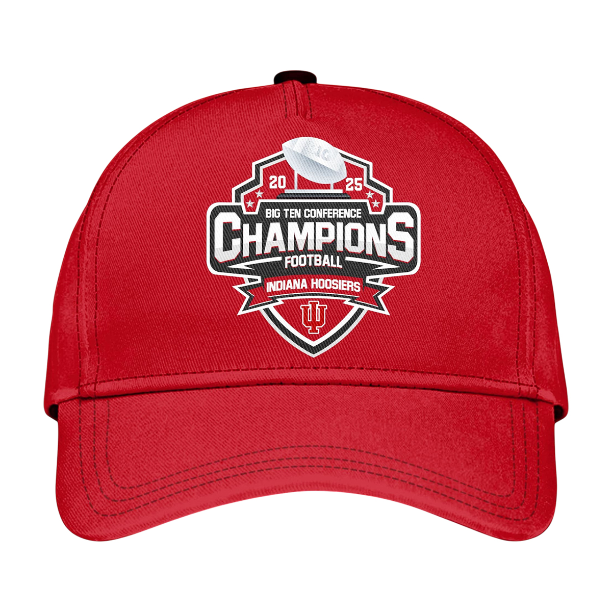 This hat features a striking red design that stands out instantly, proudly representing Indiana’s iconic colors. On the front, a bold embroidered championship emblem showcases “Big 10 Conference Champions Football,” along with the year 2025 placed on both sides of a detailed football graphic. Beneath the emblem, “Indiana Hoosiers” is stitched clearly, paired with the IU symbol for a finishing touch that fans will instantly recognize. The hat’s structured shape, curved bill, and durable stitching create a clean, athletic look suitable for game days, tailgates, alumni gatherings, or everyday wear. Every element reflects the celebration atmosphere of the championship game, making this item feel directly connected to the moment Indiana lifted the title.