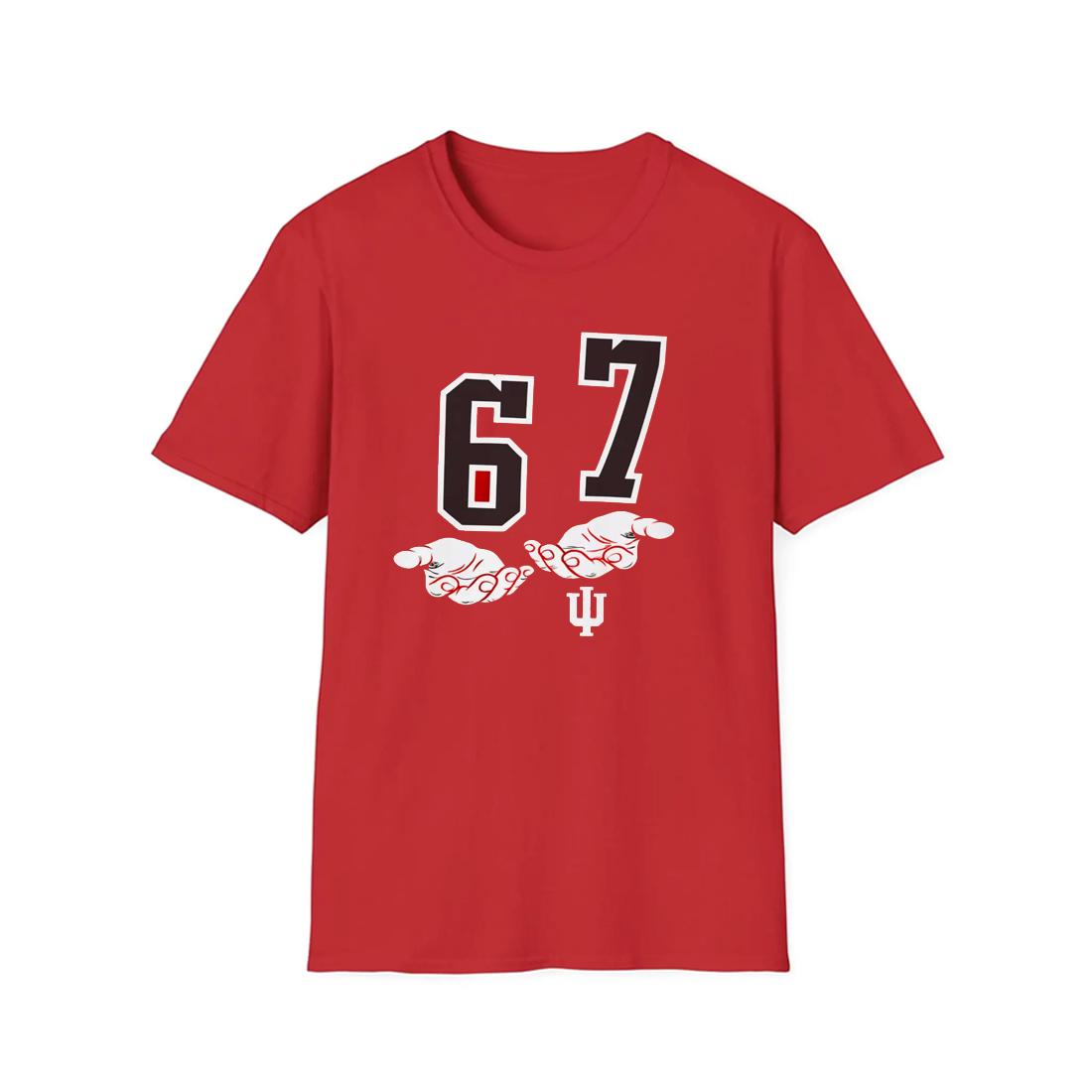 This shirt features a striking red base that immediately reflects Indiana Hoosiers pride. Front and center, the large “6” and “7” numbers dominate the design, styled in bold black with white outlines for high contrast and instant recognition. Beneath the numbers, illustrated hands appear to be holding the score up, adding a humorous, almost mythic touch to what started as a simple scoreboard moment.