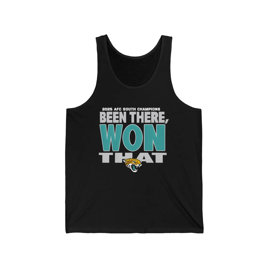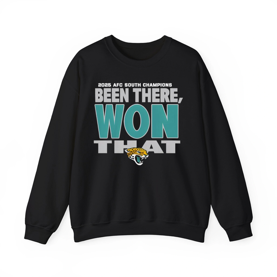 The Jaguars 2025 AFC South Champions Been There Won That Shirt features a bold stacked layout that commands attention at first glance. Set on a deep black base, the words “Been There, Won That” stand tall in strong teal and gray tones, creating contrast and instant readability. Above the main message, the reference to the 2025 AFC South Champions season anchors the design to a specific accomplishment, while the jaguar head graphic below adds unmistakable identity and pride.