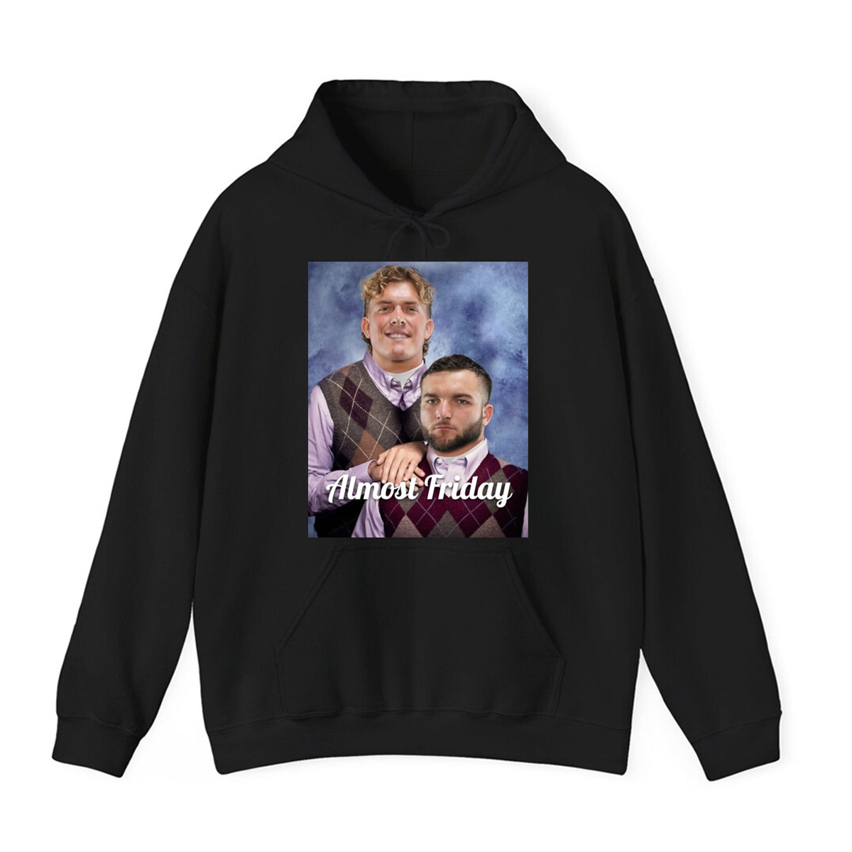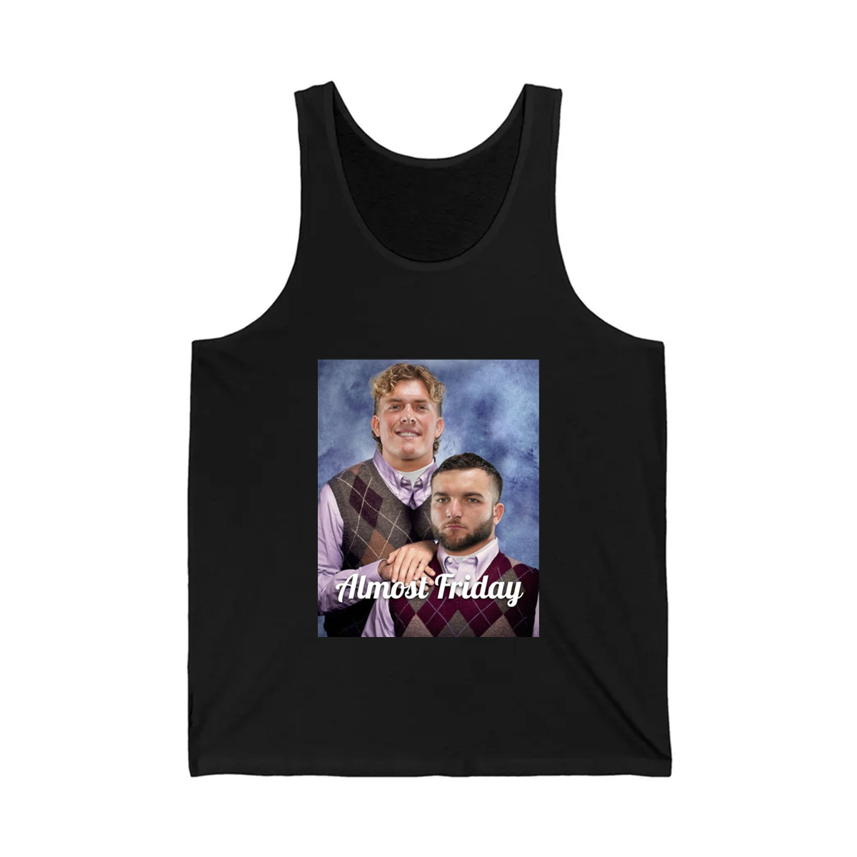 The players are featured wearing matching argyle sweater vests, perfectly parodying the film. Below the image, the phrase “Almost Friday” is printed, tying the design to the universal excitement for the next weekend of college sports. This shirt doesn’t just show support for their athletic skill; it celebrates their status as cultural icons within the sport’s fandom, making it an instantly recognizable piece of custom art.