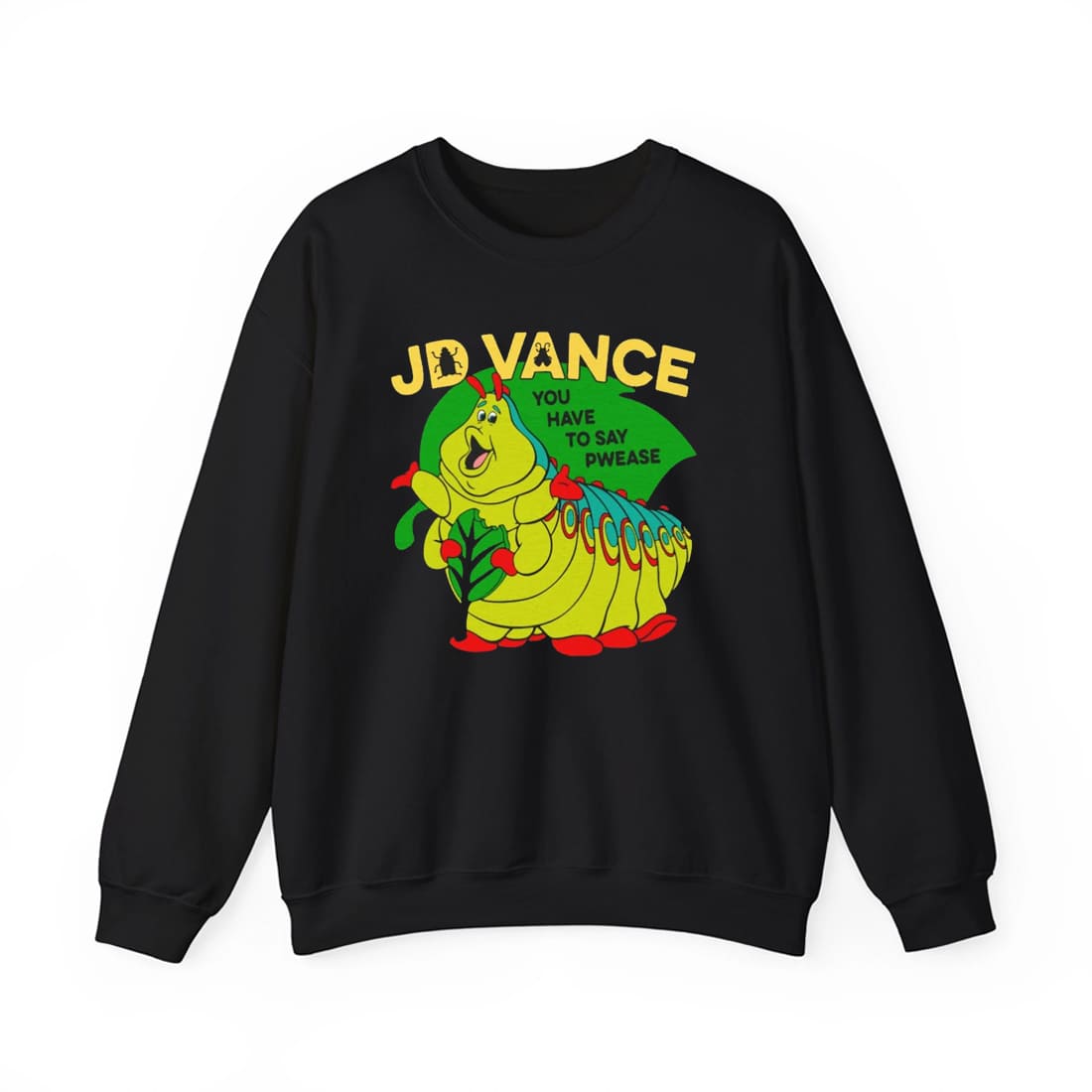 The JD Vance You Have To Say Pwease Shirt is a classic black, short-sleeve tee featuring a vibrant cartoon caterpillar from Disney’s Alice in Wonderland. This colorful critter, with its yellow-green face, blue and yellow segmented body, and red slippers, holds a leaf while lounging on a green base. Above the caterpillar, bold yellow text reads “JD VANCE,” while below, the phrase “YOU HAVE TO SAY PWEASE” pops in the same hue, with the playful “pwease” adding a mocking, toddler-like twist that’s sure to raise eyebrows and laughs.