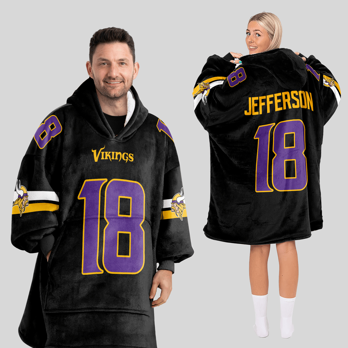 The Jefferson Minnesota Football 18 Unisex Blanket Hoodie brings the excitement of the field to your everyday life. Its crisp white base contrasts perfectly with deep purple and gold accents, creating a bold, dynamic look that stands out. The front features the Vikings logo and an action image of the star receiver mid-play, printed above a large “18” that symbolizes confidence and dominance. The back proudly displays “JEFFERSON” and the number 18 in striking purple block lettering, honoring one of the most explosive talents in the game. Subtle sleeve stripes and shoulder details complete the design, giving it that authentic game-day edge.