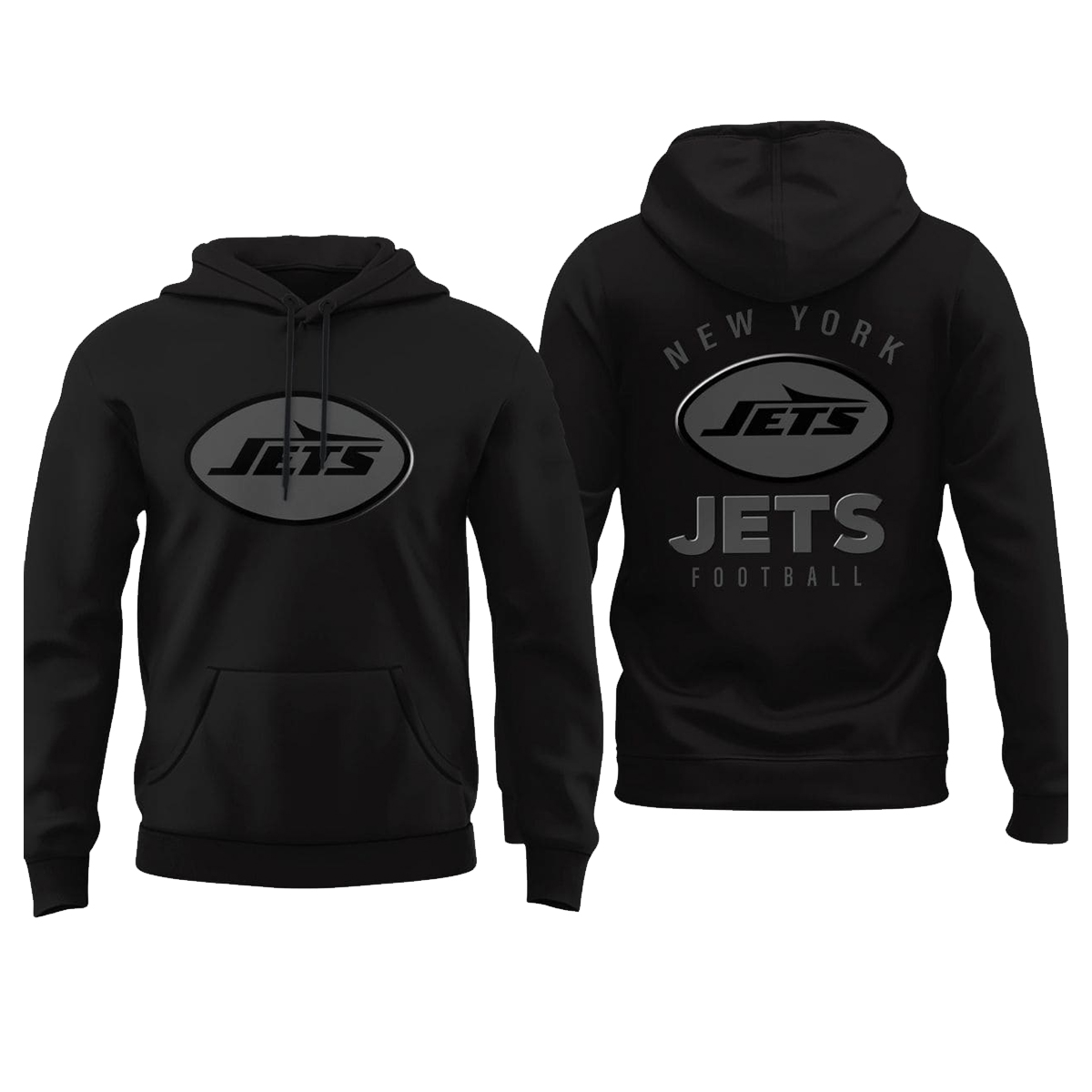 The front showcases a sleek, matte-grey Jets emblem set inside an oval frame, giving the hoodie a streamlined, urban vibe. On the back, a larger version of the emblem is paired with NEW YORK arched above and JETS FOOTBALL beneath it, creating a balanced, premium athletic aesthetic. The all-black fabric, kangaroo pocket, smooth drawstrings, and relaxed fit make this hoodie comfortable for cold days while still delivering a polished look.