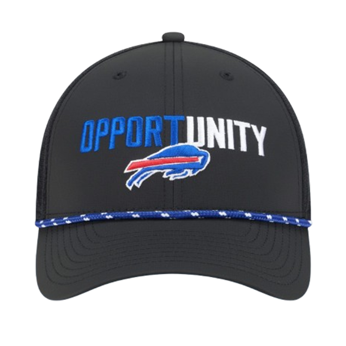 This hat features a clean black base that allows the front embroidery to stand out clearly. The word “OPPORTUNITY” is stitched across the crown in strong block lettering, split into contrasting colors for emphasis. Beneath the text sits the recognizable buffalo symbol, reinforcing the connection to Buffalo football culture without overwhelming the design. Along the brim, a subtle patterned rope detail in blue and white adds depth and texture, giving the hat a modern yet classic finish.