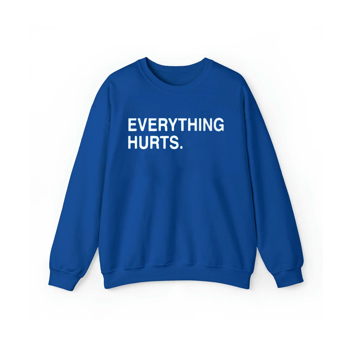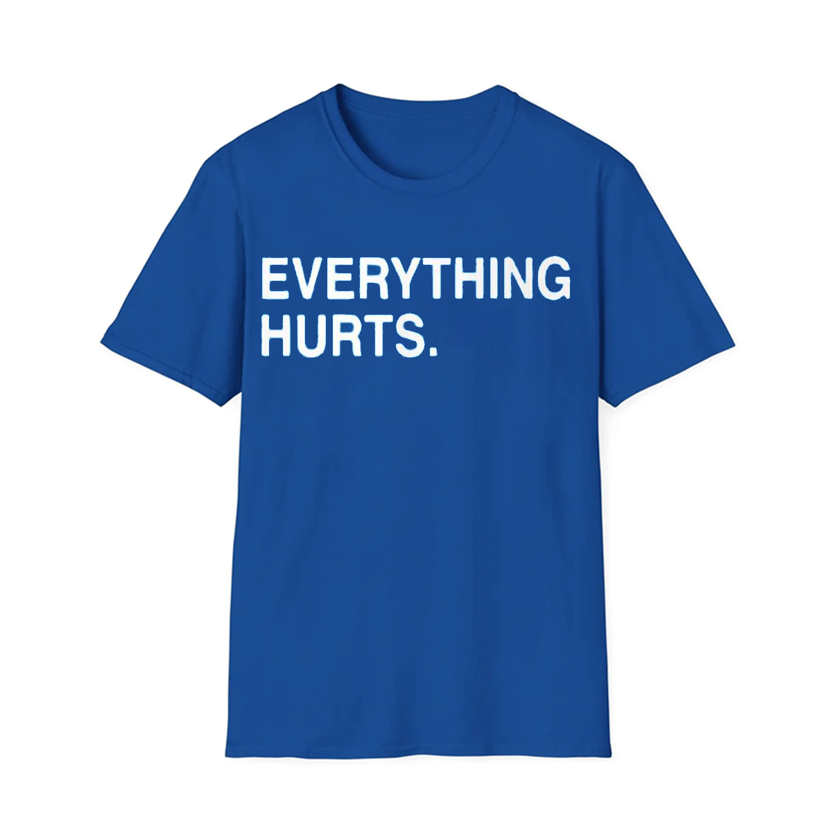 The Justin Turner Everything Hurts Shirt features a minimalist yet powerful design. On a vibrant blue background, the shirt showcases the phrase EVERYTHING HURTS in bold white letters. This simple message resonates with anyone who’s ever had a rough day or experienced that universal feeling of exhaustion. The shirt is made from high-quality, soft cotton, ensuring a comfortable fit that lasts all day. Its classic cut makes it suitable for a relaxed, casual look, whether you’re hanging out with friends or running errands.