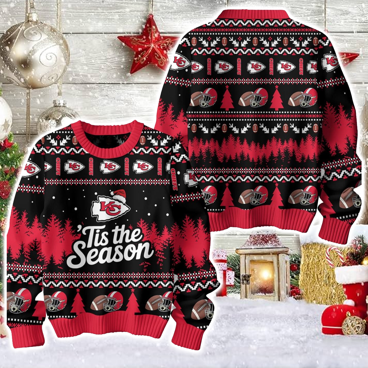 Front and center, the sweater features the iconic Chiefs arrowhead logo topped with a Santa hat, paired with the festive phrase “’Tis the Season” in bright holiday script. Surrounding the main design are rows of classic winter motifs: snowflakes, evergreen silhouettes, mini helmets, decorative footballs, and team symbols arranged in knitted-style patterns. The rich red-and-black color palette gives the sweater a bold, cozy look that feels perfectly aligned with winter celebrations. Both front and back carry matching details, ensuring your style is festive from every angle.