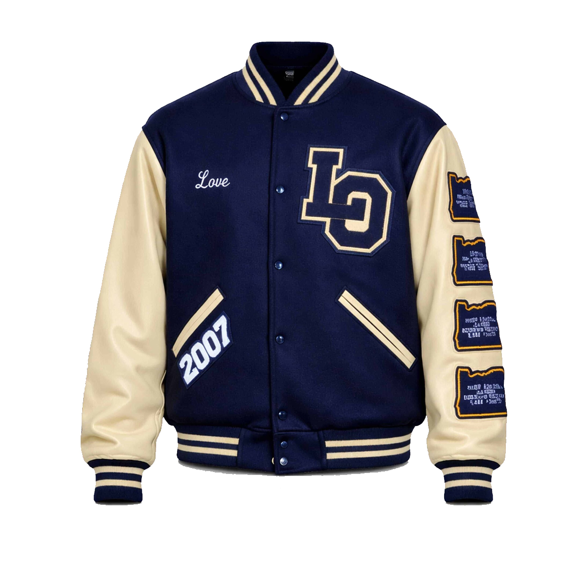 Designed in a traditional letterman silhouette, this jacket features a rich navy body paired with contrasting cream sleeves, creating a bold yet timeless color combination. The front showcases classic varsity elements, including stitched lettering, year-style numbering, and detailed patches that echo high school athletics culture. On the chest, subtle script details add a personal, almost nostalgic touch, while the sleeve patches reference milestones and seasons tied to Love’s early playing days.