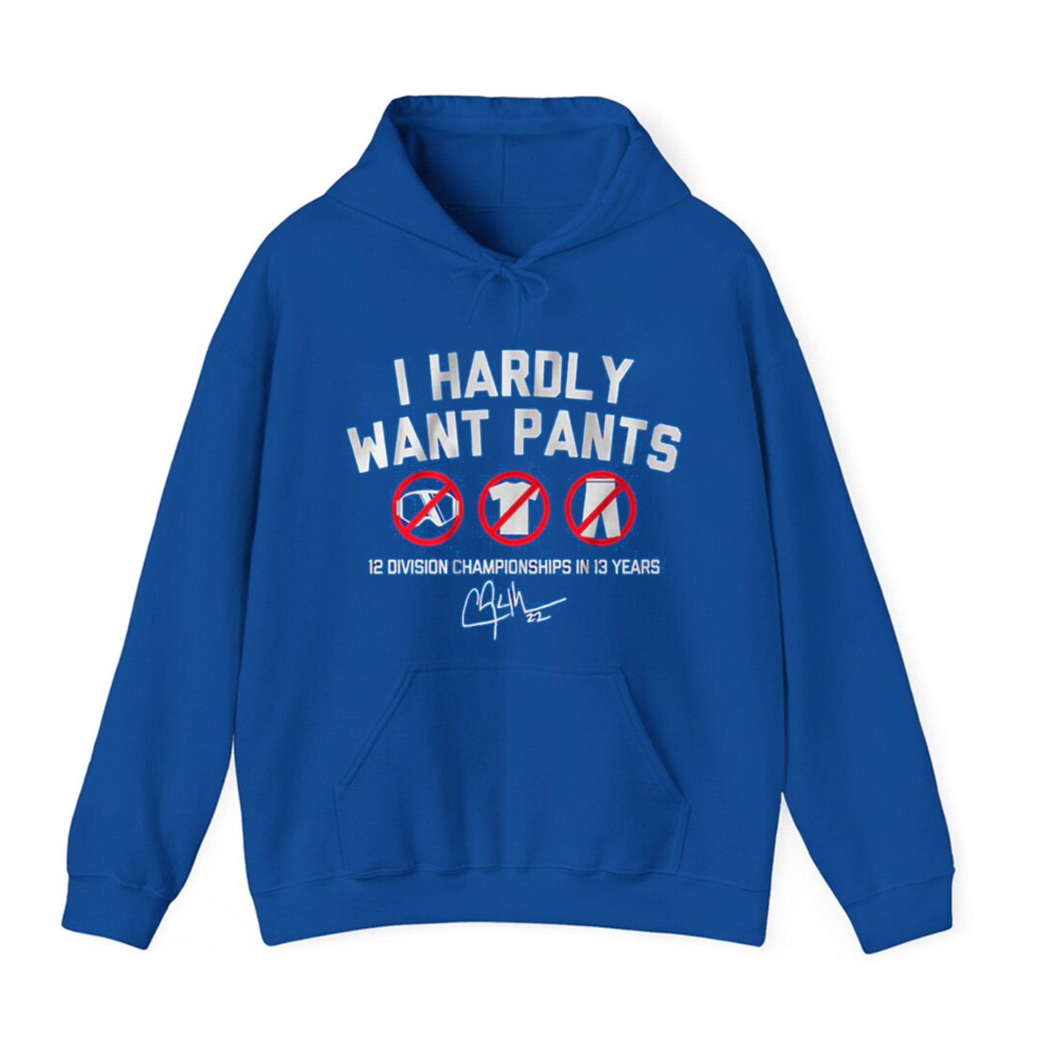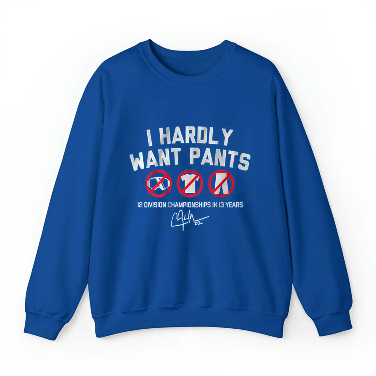The design features bold, white block letters that read I Hardly Want Pants”, paired with three hilarious icons of banned pants styles all humorously crossed out. Below the graphics is a proud statement 12 Division Championships in 13 Years, showcasing the impressive legacy of Kiké Hernandez and the dominant teams he’s been a part of.