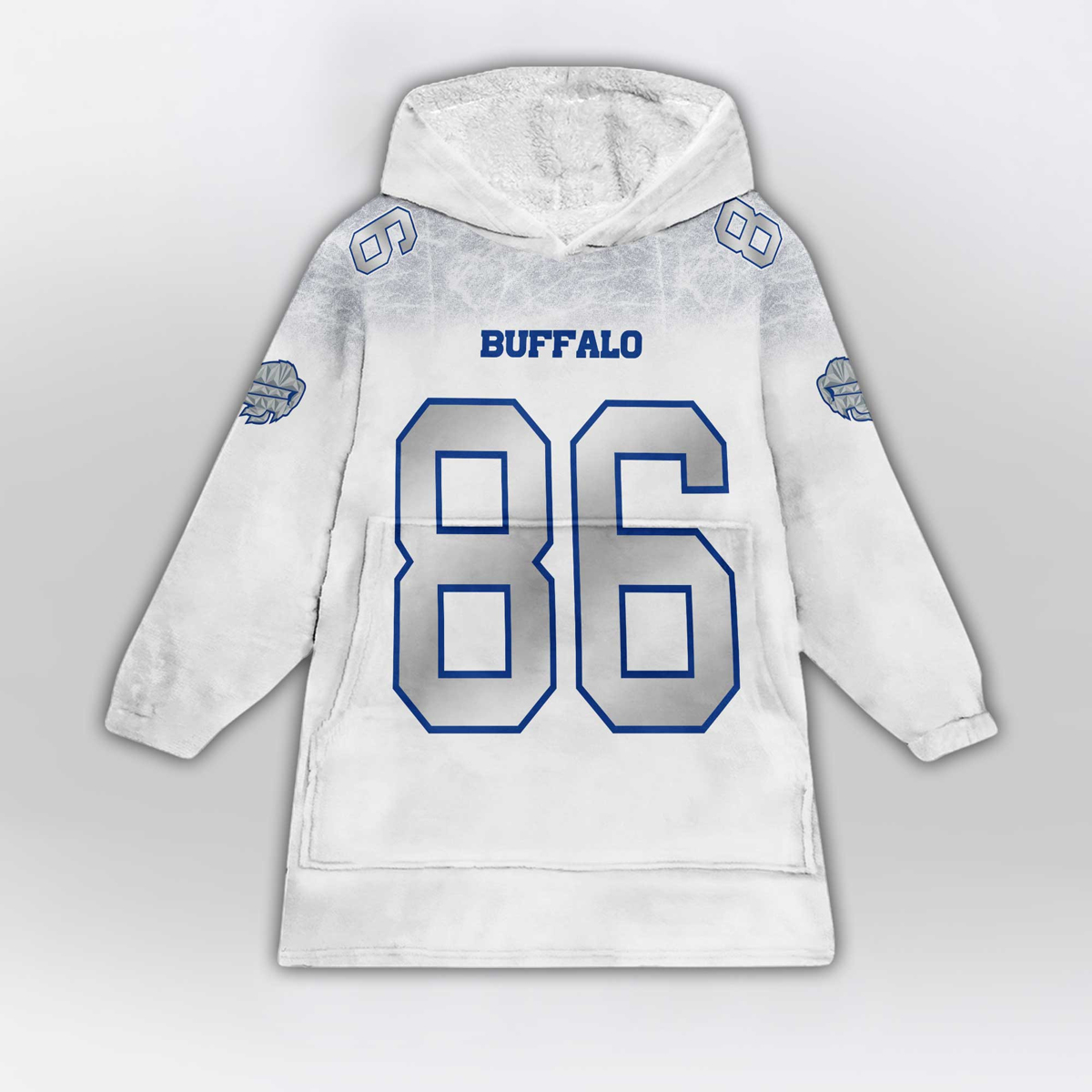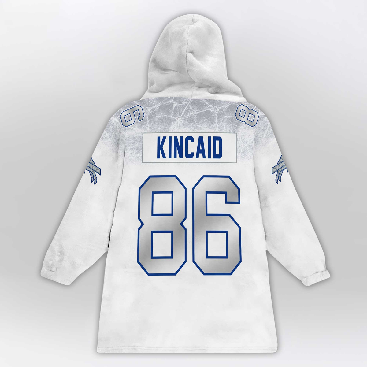 The Kincaid 86 Bills Football Unisex Blanket Hoodie embodies both style and team spirit. Its crisp white color contrasts perfectly with bold royal blue accents, showcasing the classic “BUFFALO” lettering across the chest. The front features a large “86” outlined in blue, symbolizing strength and confidence, while the back proudly displays “KINCAID” and the same number in solid block print. The attention to detail extends to the sleeves, which include blue numbers and subtle team patch graphics, adding depth and authenticity to the design.