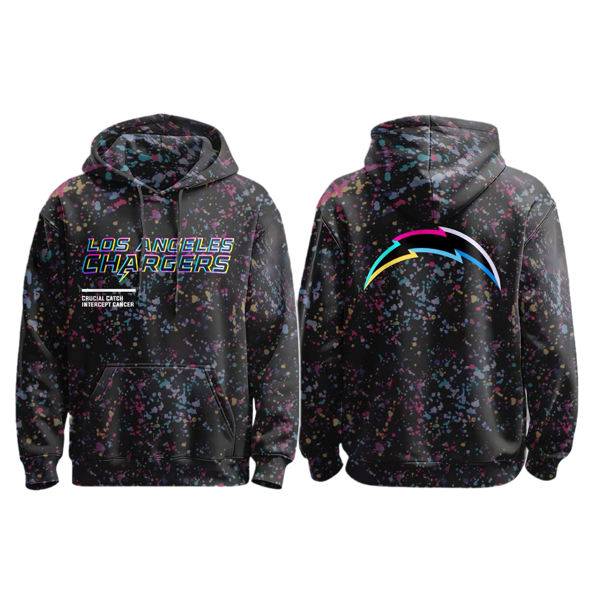 The LA Chargers Crucial Catch 2025 Hoodie is set on a sophisticated black base, covered with an immersive, all-over, multi-colored splatter design. Across the chest, the text LOS ANGELES CHARGERS is displayed in a sharp, multi-color gradient, positioned directly above the essential message: CRUCIAL CATCH INTERCEPT CANCER. This core message cleverly links the decisive moments of the game the crucial catch, the interception with the life-saving mission to aggressively combat and prevent cancer.