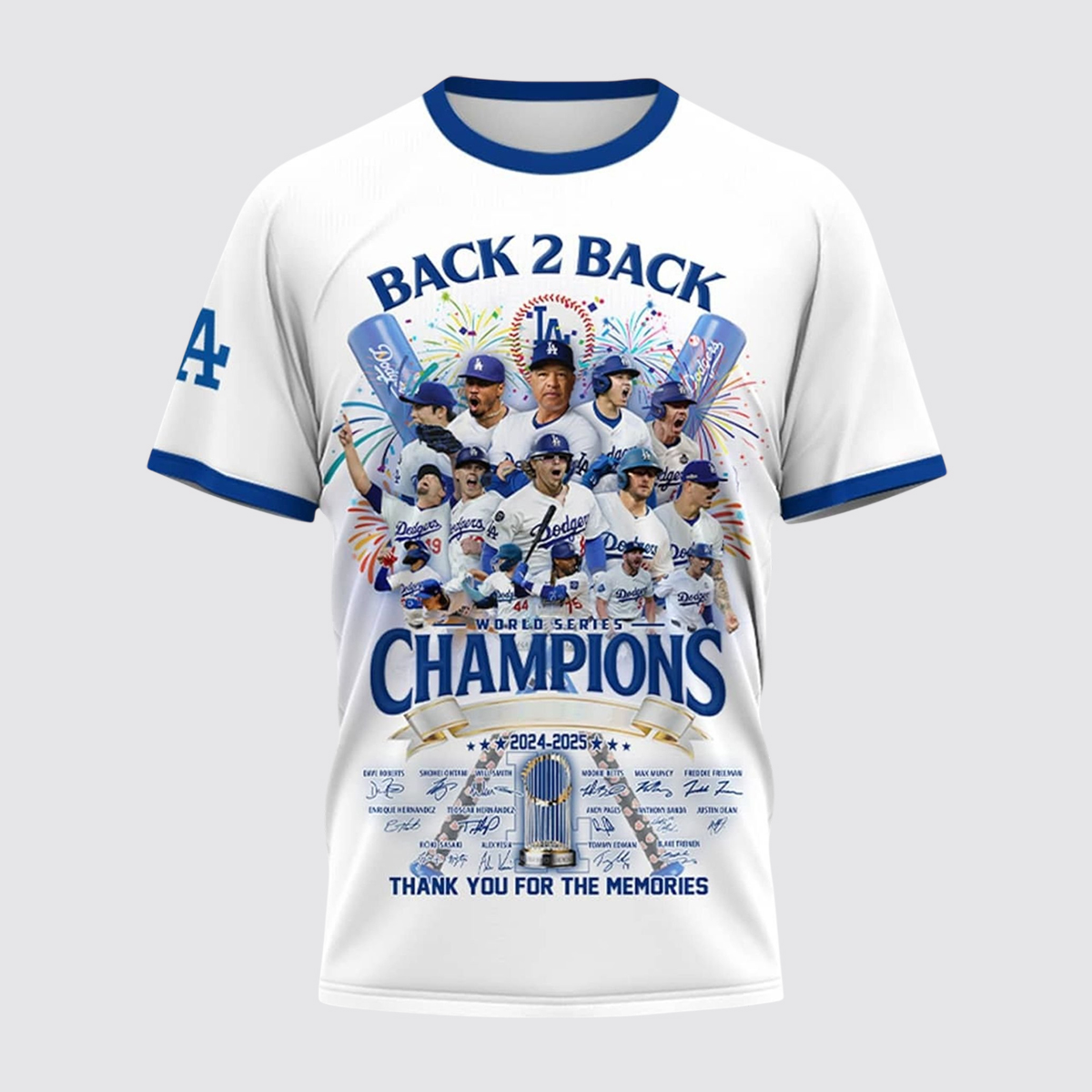 This LA Dodgers Back 2 Back World Series Champions 2024 2025 Shirt is a powerful tribute to two seasons of brilliance and grit. The vibrant design is centered around a celebratory image of the team’s biggest stars and their triumphant manager, surrounded by fireworks and the iconic World Series trophy. Bold BACK 2 BACK lettering frames the design, symbolizing the consecutive victories. The entire garment is crowned with the heartfelt message THANK YOU FOR THE MEMORIES. This shirt is a testament to the teamwork, clutch performances, and unwavering commitment that defined the Dodgers’ historic back-to-back championships. It represents more than wins; it embodies the forging of a dynasty, a banner of pride for every true supporter.
