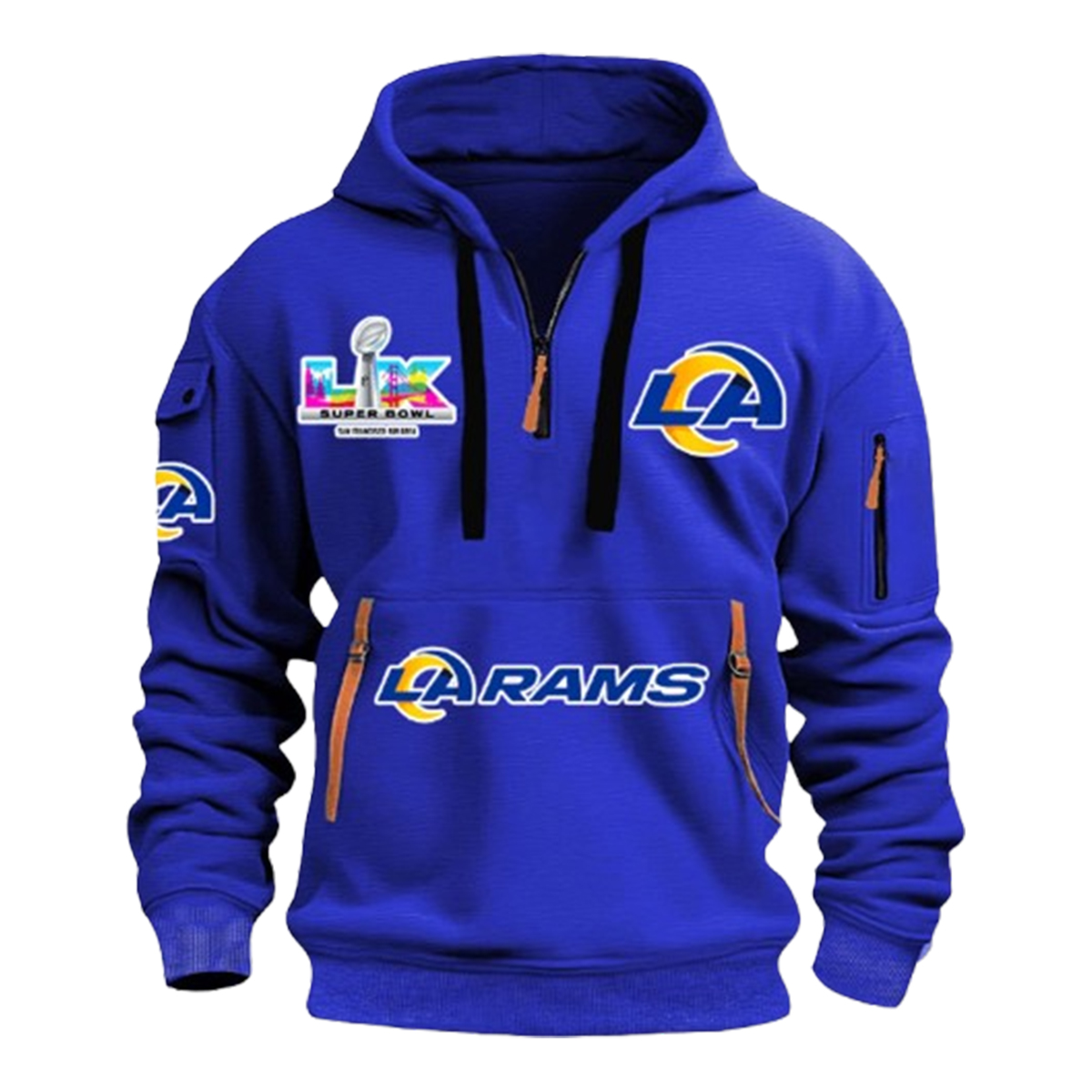 This quarter zip hoodie features a deep royal blue base that instantly commands attention. The front design highlights the LA Rams name across the center pocket area, paired with a prominent “LA” emblem on the chest that reinforces team pride from the first glance. On the opposite side, a colorful Bowl 2026 patch adds context and meaning, marking a milestone moment tied to one of the most watched sporting events of the year.