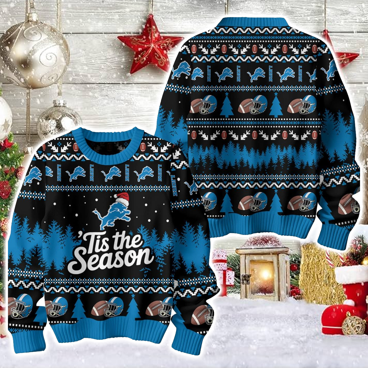 Front and center, the sweater showcases the leaping lion logo wearing a playful Santa hat, paired perfectly with the phrase “’Tis the Season” in festive script. Surrounding this centerpiece are rows of classic winter motifs, including pine trees, snowflakes, football helmets, and decorative footballs, arranged in knitted-style patterns that stretch across the front, sleeves, and back. The deep forest silhouette and bright blue accents create a winter-night atmosphere that feels warm, bold, and unmistakably festive.