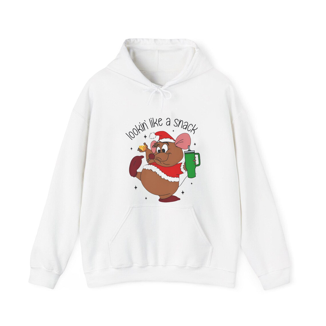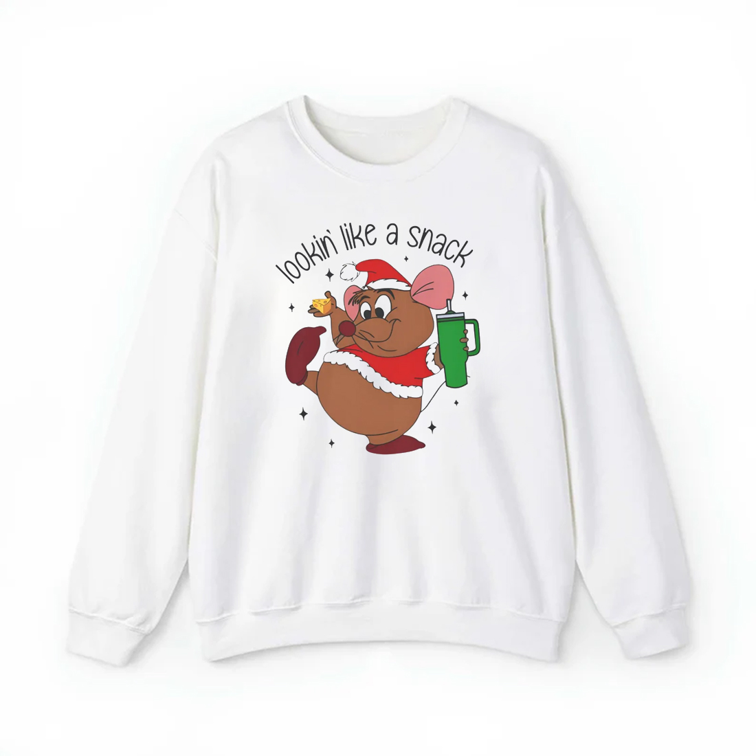 This shirt features a bright white base that keeps the artwork crisp and eye-catching. At the center is a charming cartoon mouse dressed in a Santa-inspired outfit, holding a snack and a green drink mug, mid-pose as if proudly showing off. Above the illustration, the curved text “lookin like a snack” ties the entire design together, reinforcing the joke in a lighthearted, confident way. Small decorative sparkles surround the character, adding movement and extra charm without overwhelming the design.