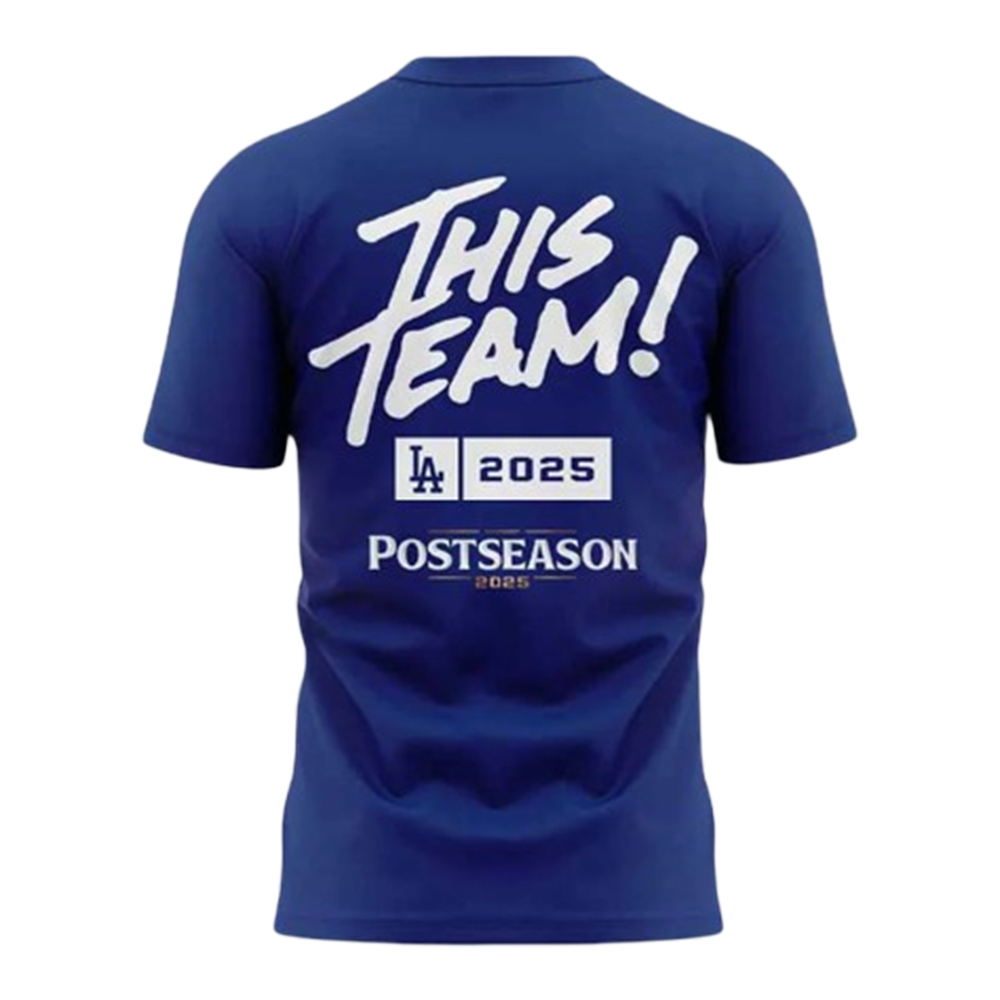 This premium Los Angeles Dodgers Be Here For October 2-sided T-Shirt is designed for the postseason. The front features a bold, vintage-inspired design with October Baseball and LA 2025 in crisp white. The phrase POSTSEASON is proudly displayed below. The back features an equally dynamic design with the phrase THIS TEAM and the LA 2025 logo, all tying together to create a powerful and cohesive design.