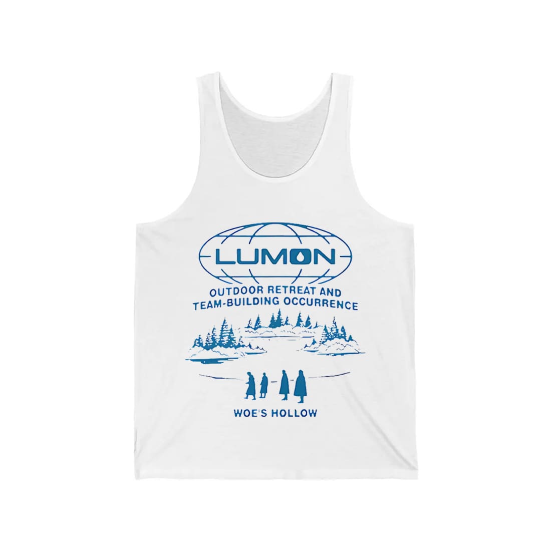 This soft, short-sleeve white cotton tee features a blue graphic: “LUMON” in a globe logo, “OUTDOOR RETREAT AND TEAM-BUILDING OCCURRENCE” in bold text, and silhouettes of four figures in coats trekking a snowy, pine-lined landscape. “WOE’S HOLLOW” adds a mysterious touch. Durable, comfy, and machine-washable, it’s great for casual wear or cosplay.