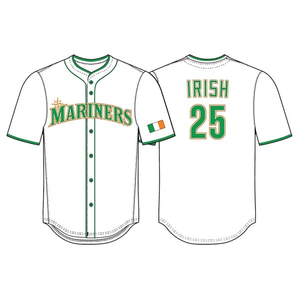 This white jersey features the Mariners wordmark in vibrant green and gold, accented with green piping on the sleeves, collar, and buttons. “IRISH” and the number 25 shine proudly on the back, while an Irish flag patch on the sleeve completes the festive design.