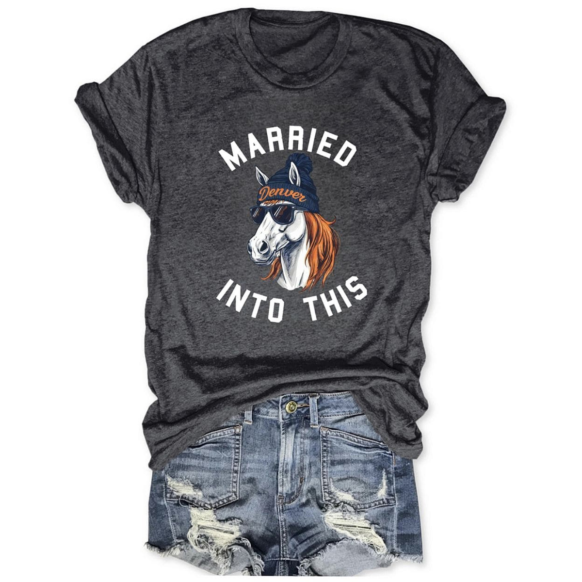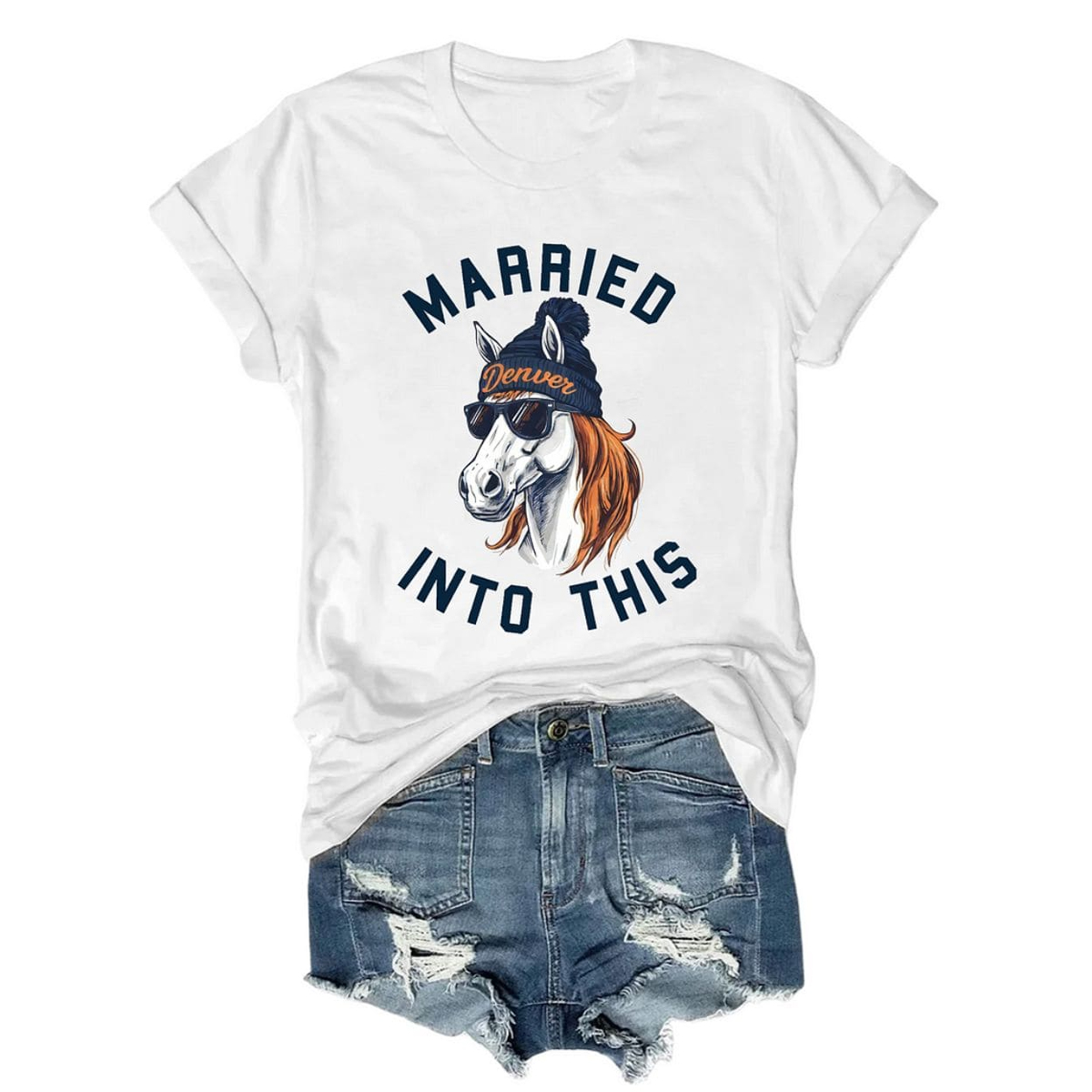 The design immediately catches the eye with its playful illustrated graphic. Centered on the shirt is a stylized horse character wearing sunglasses and a beanie marked with “Denver,” creating a bold, witty nod to Mile High football culture. The phrase “MARRIED INTO THIS” arches clearly above and below the artwork, making the message impossible to miss. Set against a clean white background, the graphic pops without feeling cluttered, keeping the look light, modern, and easy to style. The illustration balances charm and attitude, making the shirt feel expressive without being over the top.