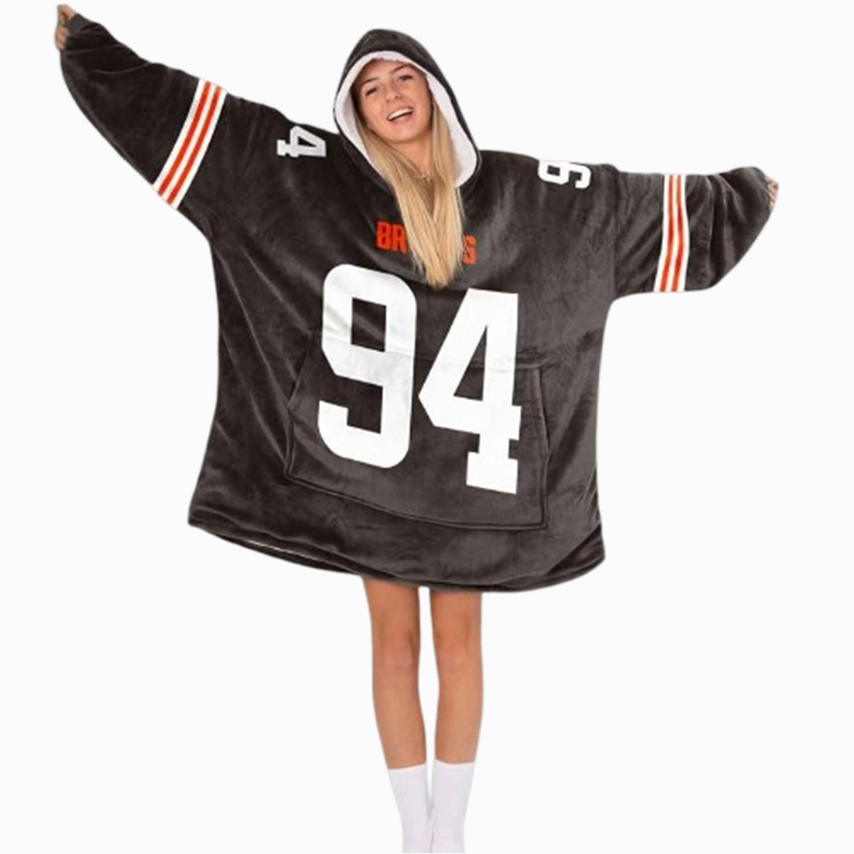 Built for fans who love grit and hustle, this oversized blanket hoodie celebrates the fierce spirit of No. 94. The bold front number and sleeve striping bring a classic gridiron vibe, while the back name-and-number styling radiates star energy from every angle. The relaxed cut drapes like your favorite throw, with a deep hood and generous pocket that invite you to settle in and stay cozy.