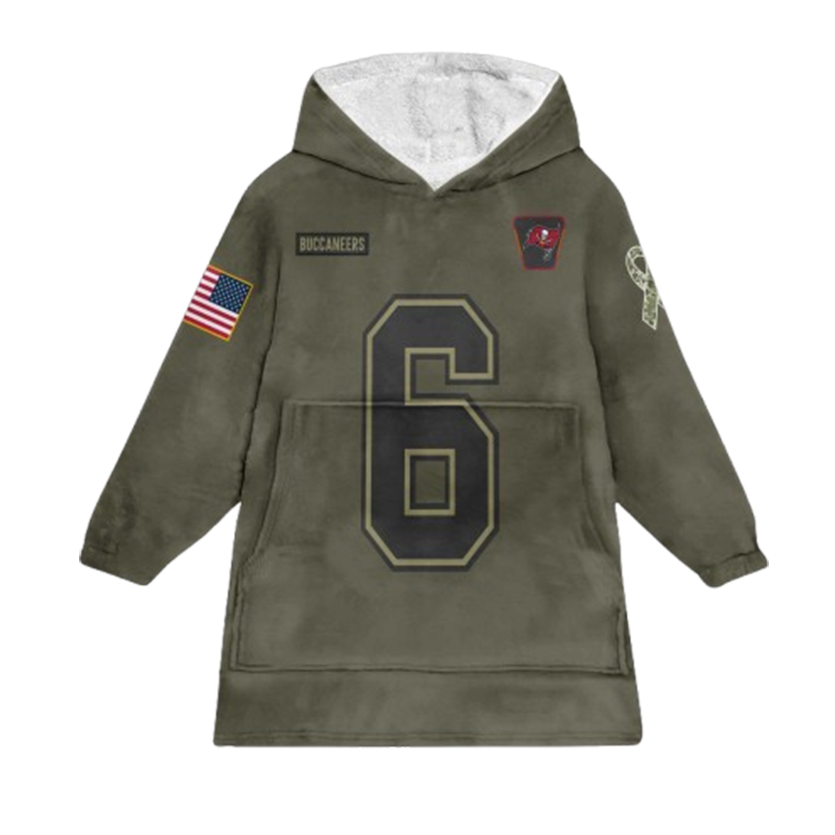 The front of the hoodie proudly displays the large number 6 along with the team’s helmet logo and the BUCCANEERS wordmark on the chest. The sleeves feature patches, including a U.S. Flag patch on the left arm, further emphasizing the theme of tribute. The back of the garment carries the player’s name, MAYFIELD, above the large number 6. This specific military-inspired design became particularly popular as a special appreciation theme, celebrating the team’s connection to the armed forces and adding a powerful, patriotic layer to the team’s merchandise.