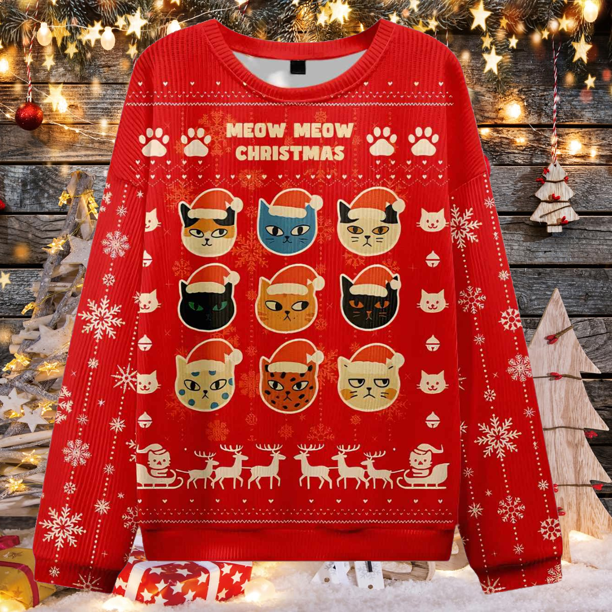 Embrace the purr fectly festive season with the Meow Meow Ugly Christmas Sweater. This cozy red garment features a traditional holiday knit pattern of white snowflakes, paw prints, and deer pulling Santa’s sleigh. The centerpiece is a grid of nine stylized cat faces, each wearing a Santa hat, showcasing a range of feline expressions.