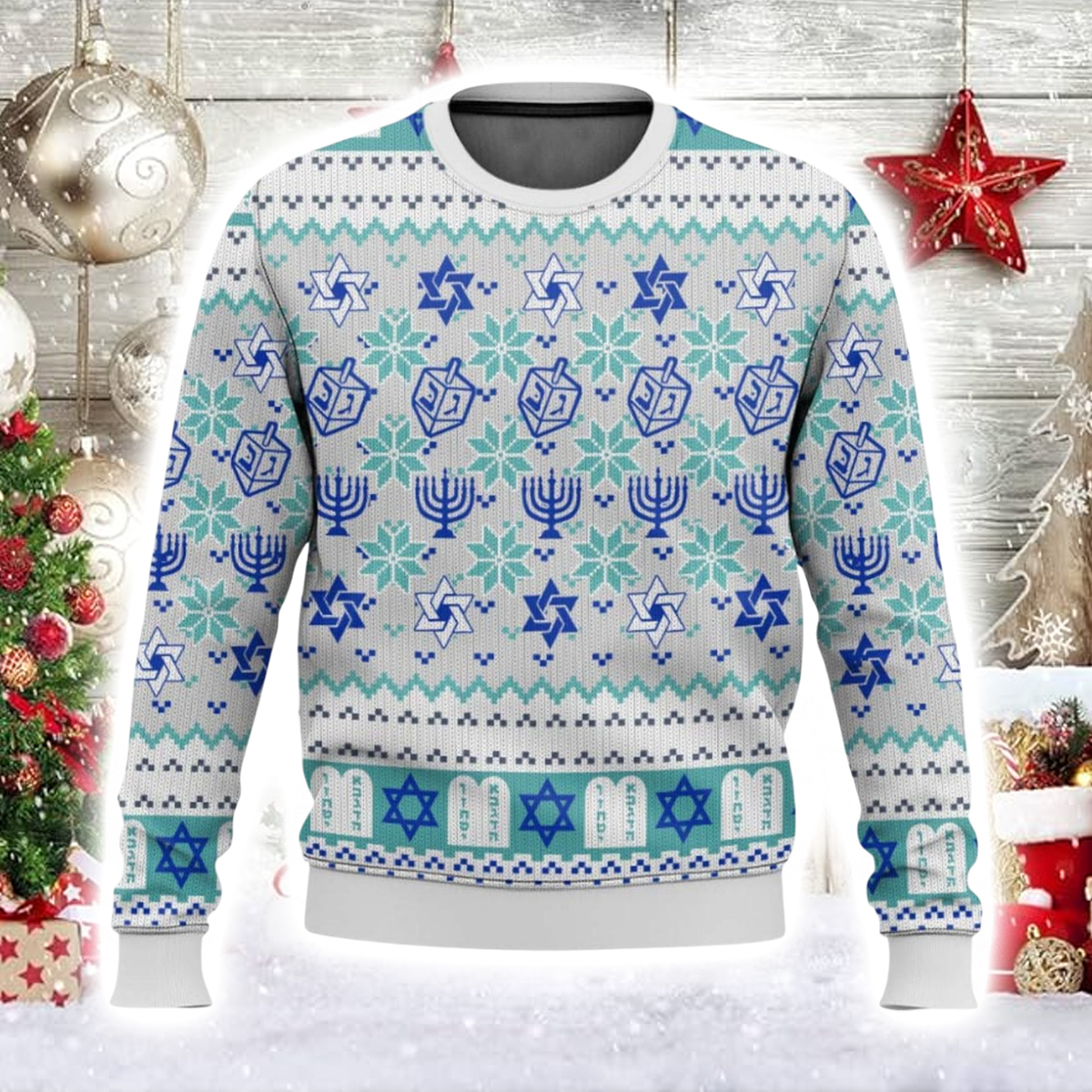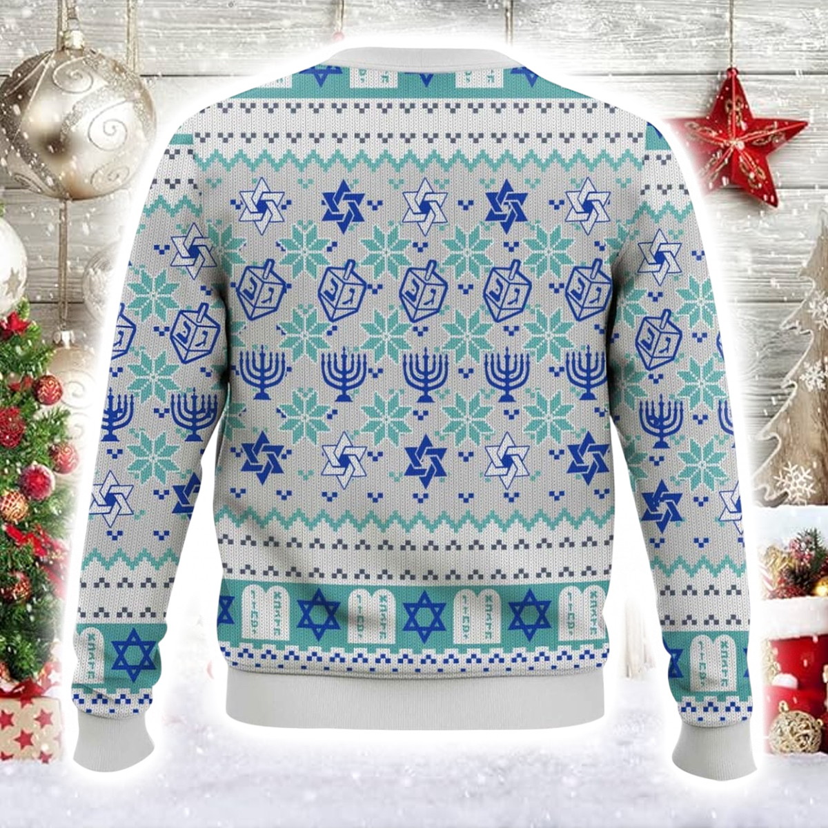 The Merry Xmas Jewish Ugly Christmas Sweater is a cheerful masterpiece woven with blue-and-white patterns inspired by Hanukkah traditions. The design features menorahs, Stars of David, dreidels, and snowflakes, all arranged in a festive geometric pattern that celebrates unity and joy. The crisp winter colors icy blue, silver, and white give it a clean, cozy aesthetic that stands out beautifully against any holiday backdrop.