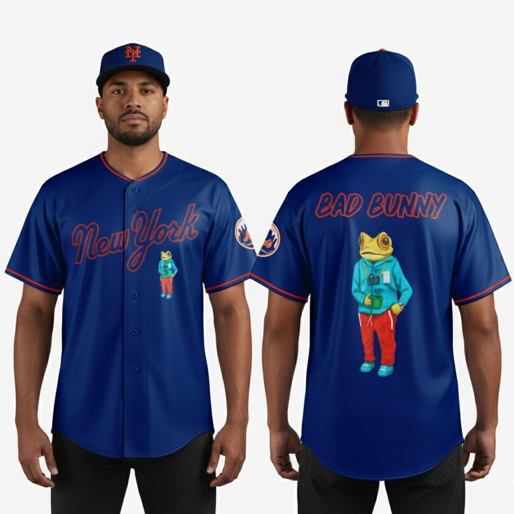 The Mets x Bad Bunny 2025 Jersey is crafted in a vibrant royal blue, featuring New York in retro script across the chest. On the front and back, a stylishly animated frog character decked out in Bad Bunny inspired street fashion adds an unexpected but unforgettable twist. The back proudly displays the name Bad Bunny in electric red script, while the sleeve details include a classic NY patch for an added touch of city pride.