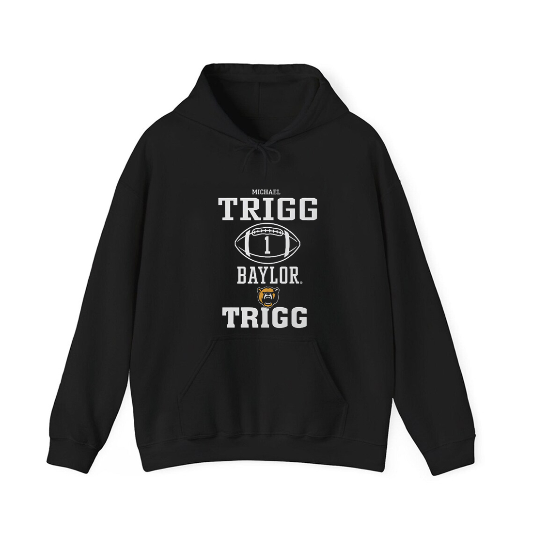 This clean, bold black t-shirt features a striking, stacked text and graphic design in white and gold/yellow. At the top, the name “MICHAEL” appears in a smaller font, followed by the prominent surname “TRIGG” in large, commanding block letters. Center stage is a classic football graphic with the number ‘1’ inside, representing his jersey number. Below the football, the word “BAYLOR” is displayed, followed by another instance of the name “TRIGG” underneath the university’s distinctive bear logo.