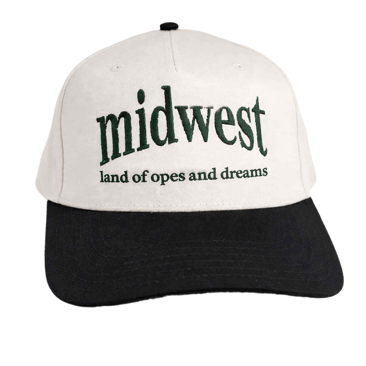 The design is clean and instantly readable. The front panel features the word “midwest” stitched in a classic serif-style font, followed by the phrase “land of opes and dreams” beneath it. The dark green embroidery contrasts beautifully against the light-colored crown, giving the text a vintage, timeless look. A black curved brim grounds the design, adding balance and making the hat easy to pair with everyday outfits. It’s a simple layout, but that’s exactly what makes it work so well.